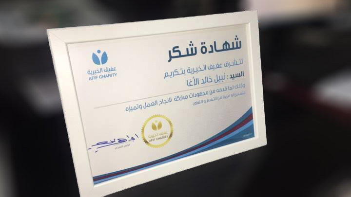 الدوحة فندق ماريوت مؤسسة عفيف الخيرية تكرم أ. نبيل خالد الأغا على جهوده، وكما تم تكريم أ. نبيل من أدارة مجلة الدوحة، وألف مبارك