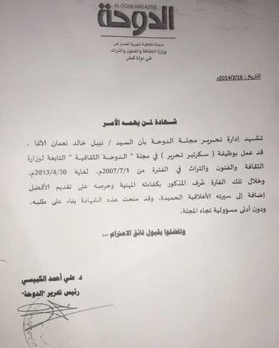 شهادة اصدرتها ادارة مجلة الدوحة ووقع عليها الدكتور علي احمد الكبيسي رئيس تحرير الدوحة بتاريخ 16-02-2014 لوزارة الثقافة والفنون والتراث خلال الفترة من 01-07-2007 ولغاية 30-04-2013 وشهد الدكتور الكبيسي بان المذكورعرف بكفاءته المهنية وحرصه على تقديم الافضل اضافة الى سيرته الاخلاقية الحميدة.