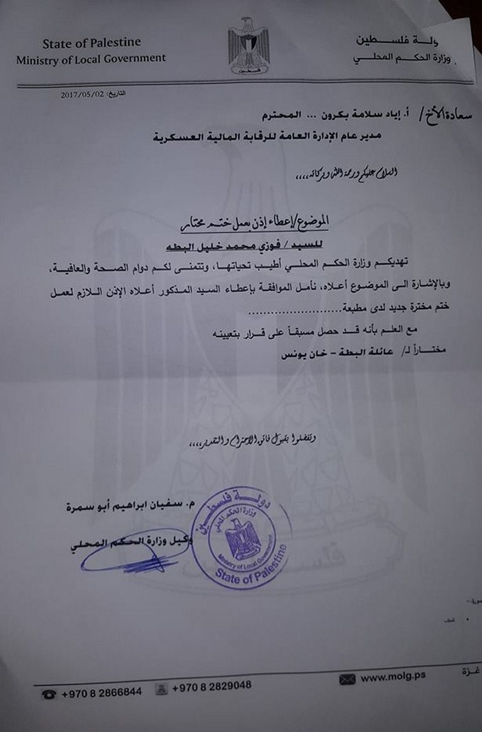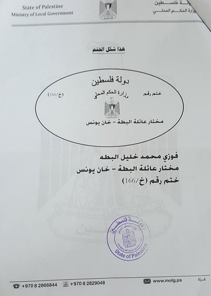 وزارة الحكم المحلي- غزة اليوم الأربعاء الموافق 03.05.2017 خلال إستلام عائلة البطة لختم مختارها الجديد د.م فوزي محمد البطة، من وزير الحكم المحلي المهندس رفيق مكي حفطه الله ،ووكيل وزارة المهندس سفيان أبو سمره، وتقدمت عائلة البطة ممثلة بمختارها والوفد المرافق المكون من عميد العائلة اللواء نبيل البطة رئيس مجلس حكماء العائلة، والدكتور ناجي البطة رئيس المجلس التنفيذي للعائلة، والأستاذ المحامي سعيد البطة رئيس اللجنة القانونية للعائلة، والأستاذ عماد البطة رئيس اللجنة الإجتماعية والعلاقات العامة، والأستاذ محمد نبيل البطة ممثل اللجنة الإعلامية و الفنية للعائلة، بالشكر الجزيل لوزارة الحكم المحلي علي جهودهم الطيبة والكريمة في خدمة الوطن والمواطن.