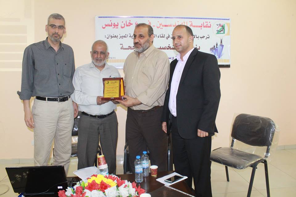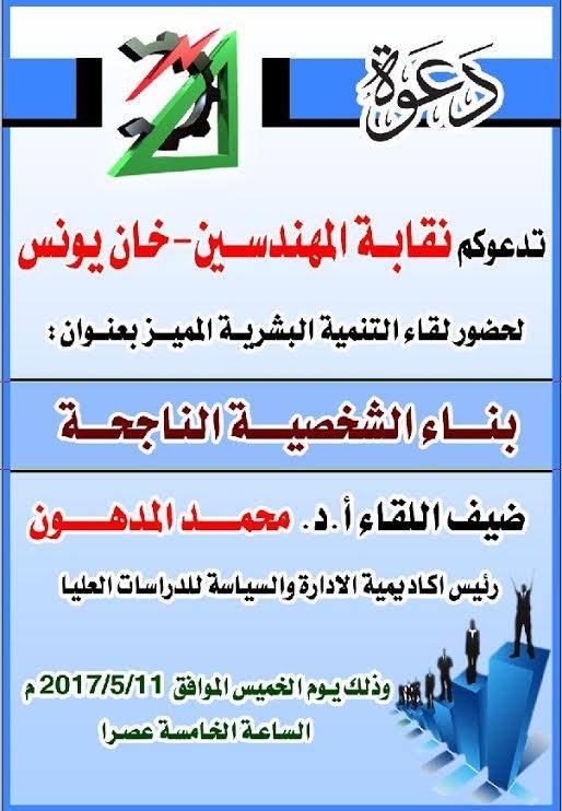 نظمت نقابة المهندسين خانيونس لقاء بعنوان بناء الشخصية المتميزة وذلك يوم الخميس الموافق 11-05-2017 بحضور ضيف اللقاء أ. د. محمد المدهون رئيس اكاديمية الادارة والسياسات العليا وعدد لفيف من المهندسين وفي بداية اللقاء رحب م. سعد عاشور - عضو مجلس الادارة بالأخ الضيف و بالأخوة المهندسين الحضور ثم أفسح المجال للأخ الضيف لإلقاء محاضرته وفي نهاية اللقاء شكر م. سعد عاشور والأخوة المهندسين الضيف على هذه المحاضرة الرائعة التي تحدث عن جوانب متعددة في بناء الشخصية الناجحة.
