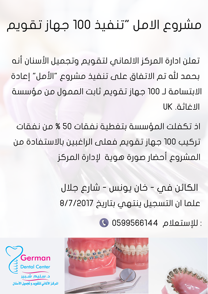 الرئيسة/إعلانات /مشروع الامل لتقويم الاسنان إعلانات مشروع الامل لتقويم الاسنان تاريخ النشر : الجمعة | 23-06-2017 | 04:37 4098 اضغط هنا للتواصل أو التعرف على الحاجة نهى يوسف حسين يوسف حسين الأغا يمكنك تلقي أحدث الأخبار أول بأول بانضمامك لإحدى مجموعات الواتساب الخاصة بالعائلة من خلال الضغط هنـا اظهر المزيد