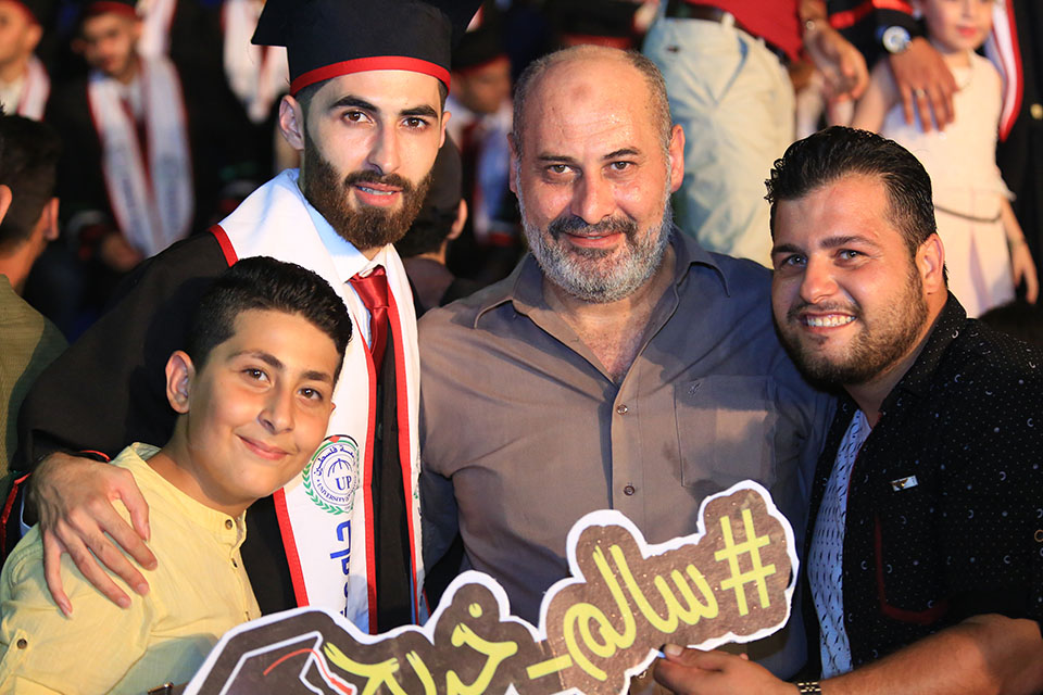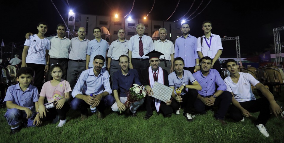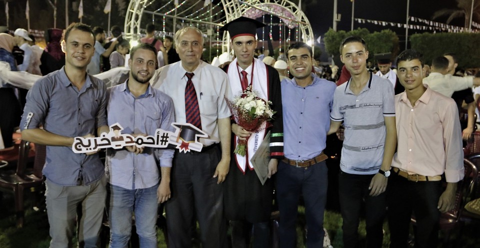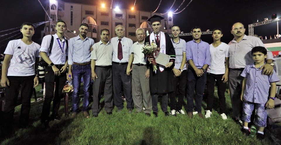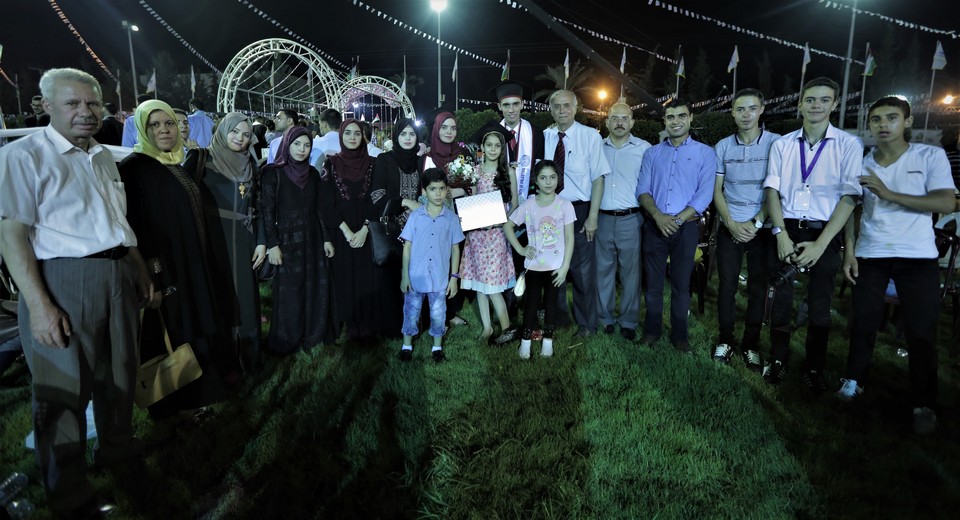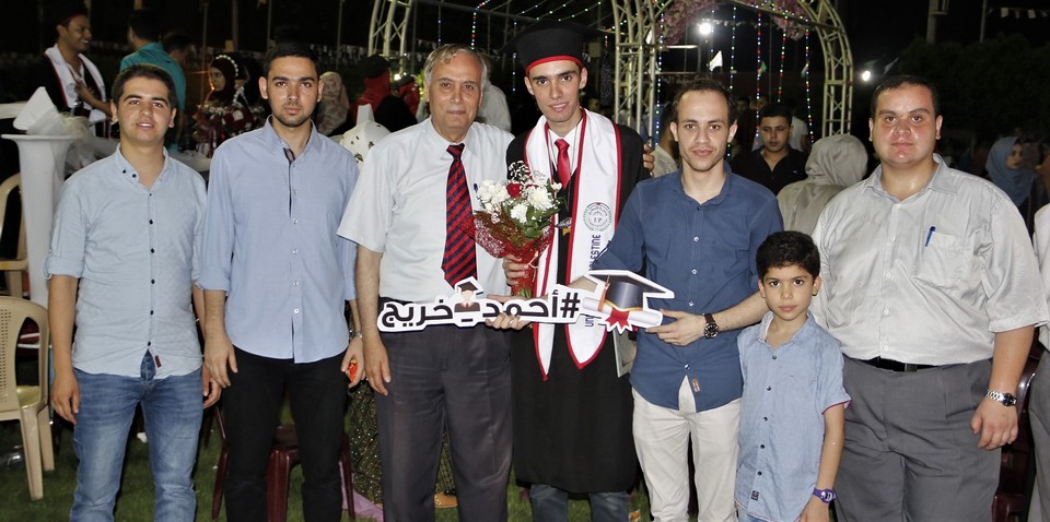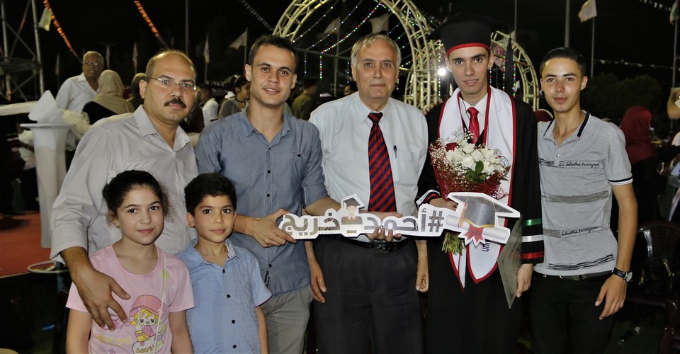 أ. يوسف نعيم الأغا، م. عماد خالد الاغا، الخريجة إبتهاج الطويل تتوسط ووالدتها أ. اية البطة وشقيقتها اميرة