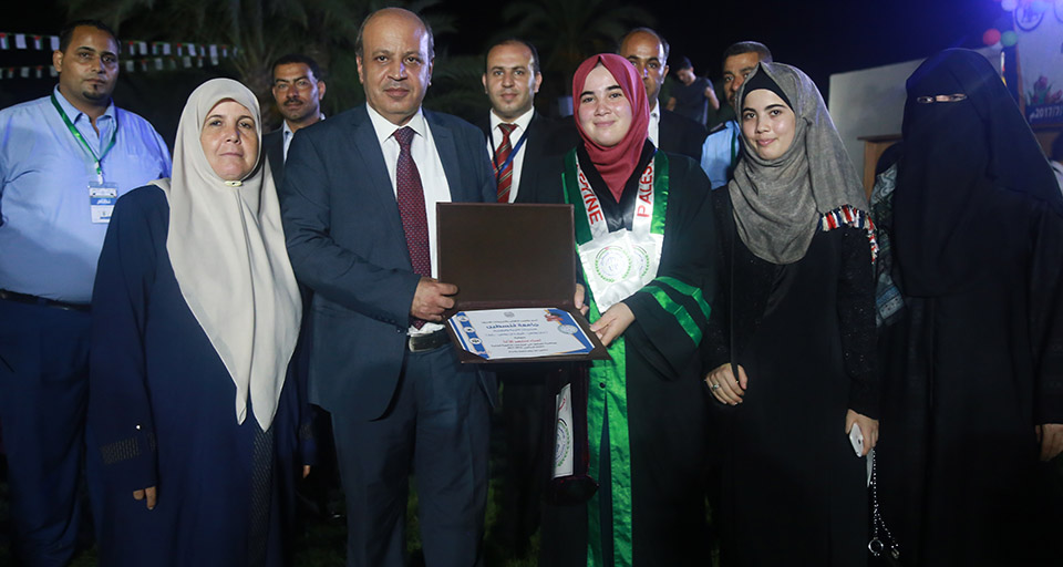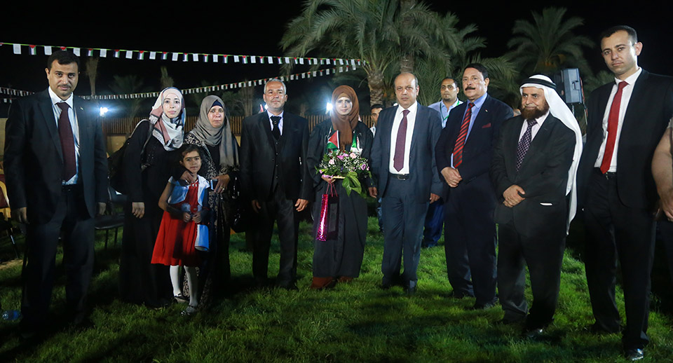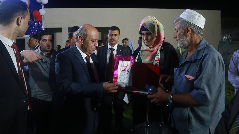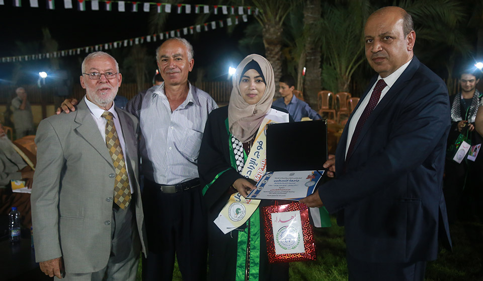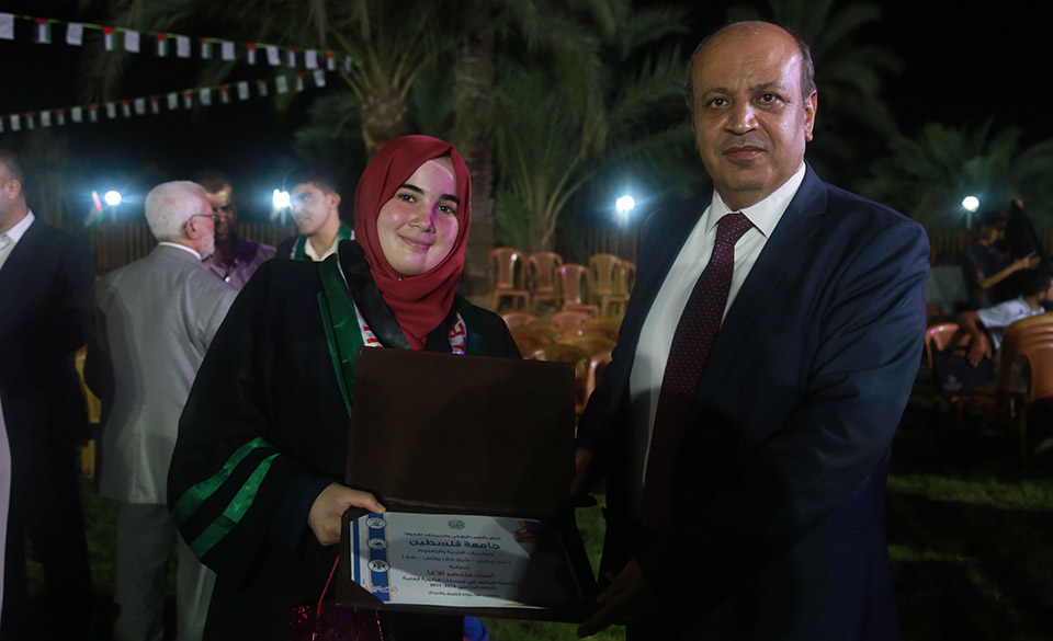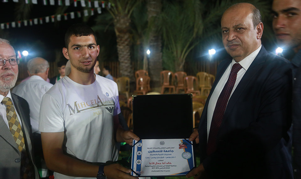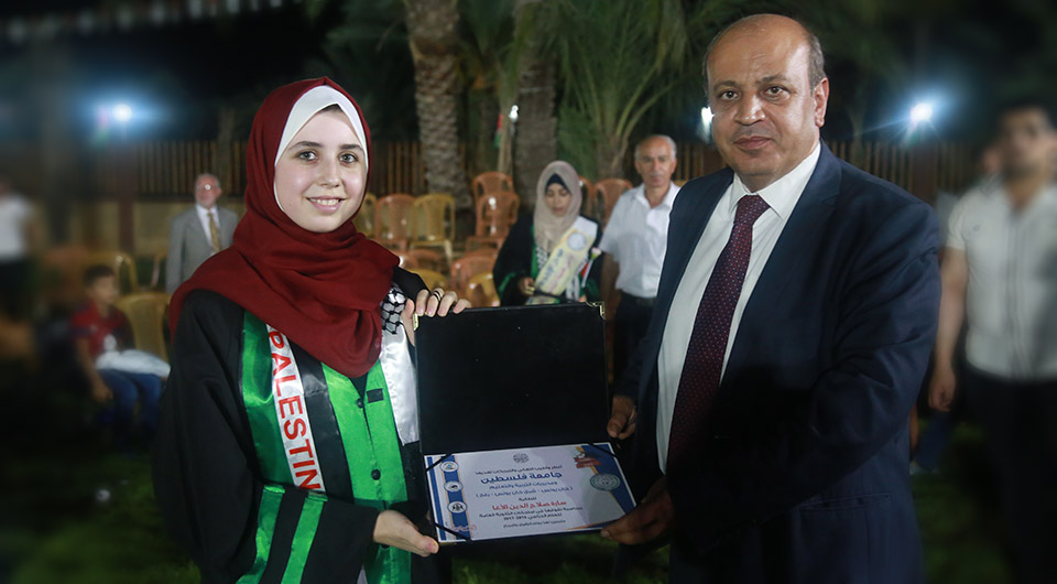 وكما تم تكريم الطلبة الناجحين من ذوي الحاجة، وخلال الحفل قدم م. عماد خالد الأغا (رئيس مجلس إدارة جامعة فلسطين) باقة ورد وهدية، إضافة إلى منحة دراسية كاملة للطالبة وردة علي الأغا.