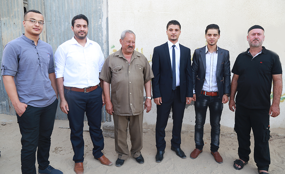 العريس يتوسط أصدقاؤه : أ. نبيل عودة الأغا (زوج شقيقة العريس)، أ. كرم الاسطل، أ. ياسر الفرا