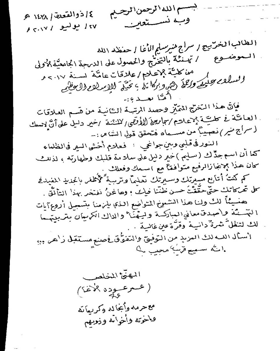 الرئيسة/متفرقات/تهنئة من أ.أبو رامي الى أ.سراج منير سليم متفرقات تهنئة من أ.أبو رامي الى أ.سراج منير سليم تاريخ النشر : الجمعة | 28-07-2017 | 10:26 4035 تهنئلة من أ.أبو رامي الى أ.سراج منير سليم اضغط هنا للتواصل أو التعرف على الأستاذ سراج منير سليم إبراهيم سليم الأغا يمكنك تلقي أحدث الأخبار أول بأول بانضمامك لإحدى مجموعات الواتساب الخاصة بالعائلة من خلال الضغط هنـا اظهر المزيد