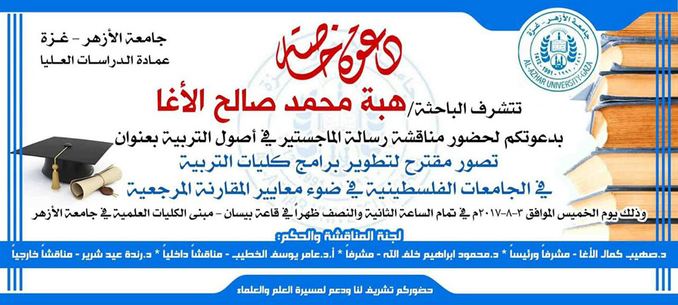 الرئيسة/تكريم/دعوة عامة لحضور مناقشة رسالة ماجستير للطالبة هبة محمد الأغا تكريم دعوة عامة لحضور مناقشة رسالة ماجستير للطالبة هبة محمد الأغا تاريخ النشر : الأحد | 30-07-2017 | 15:46 8131 اضغط هنا للتواصل أو التعرف على الدكتورة هبة محمد صالح علي عثمان الأغا يمكنك تلقي أحدث الأخبار أول بأول بانضمامك لإحدى مجموعات الواتساب الخاصة بالعائلة من خلال الضغط هنـا اظهر المزيد