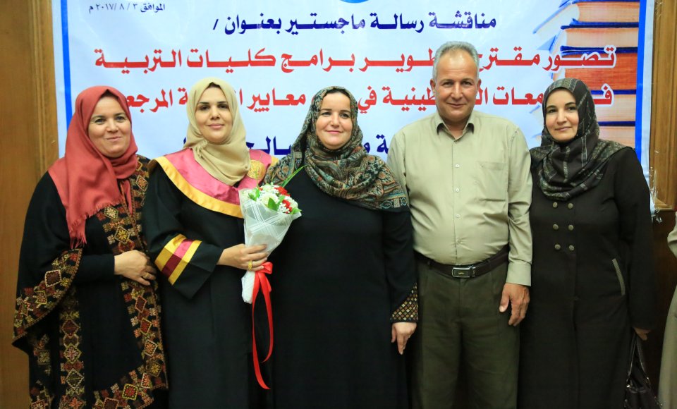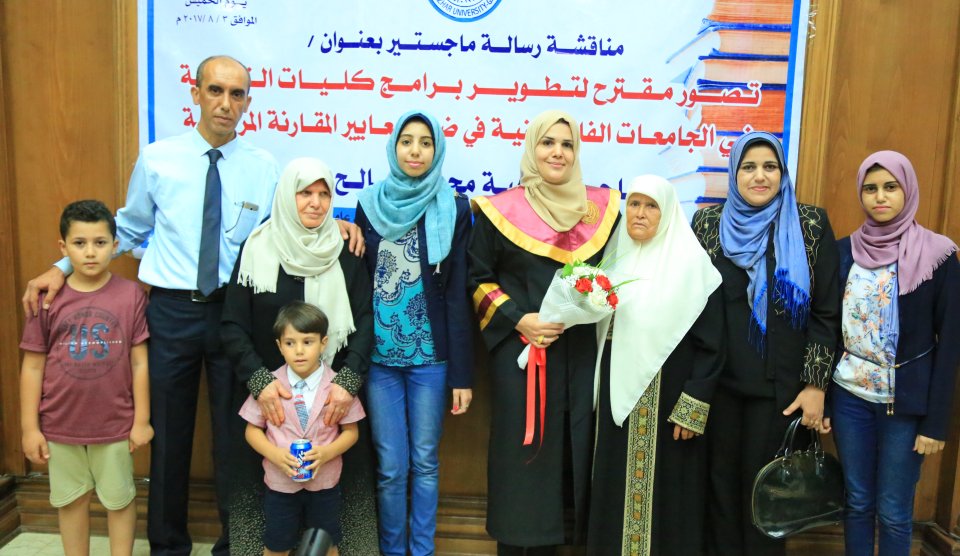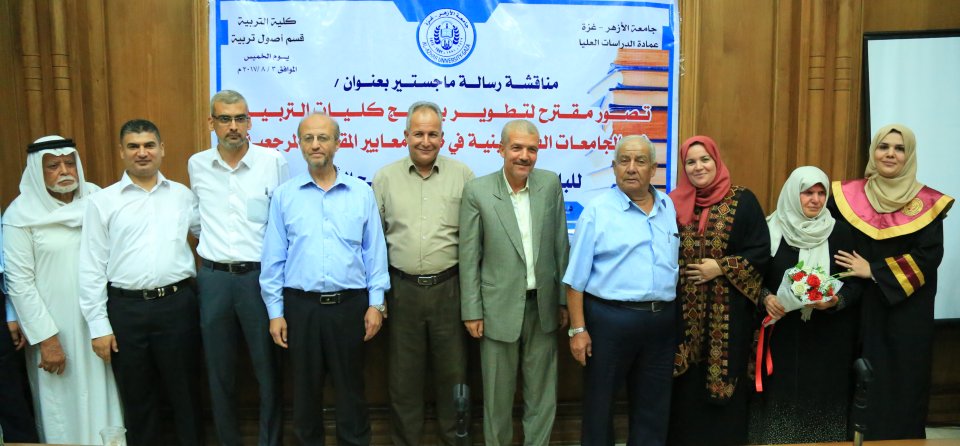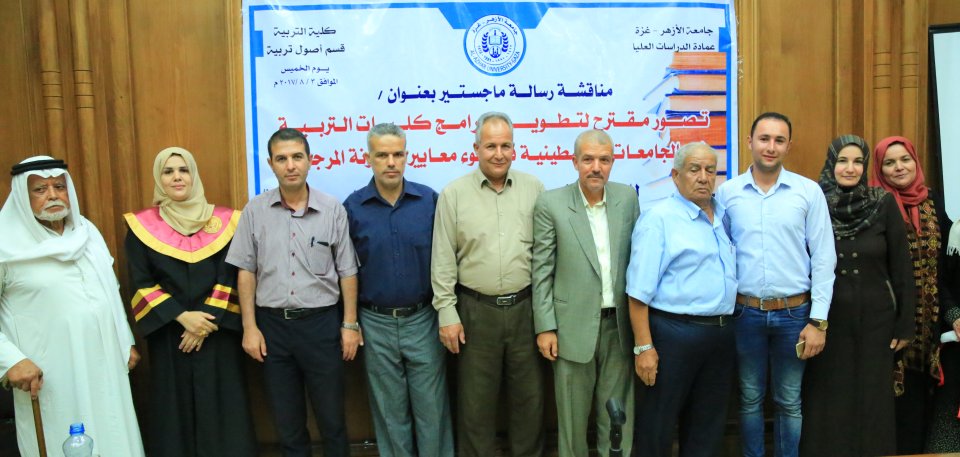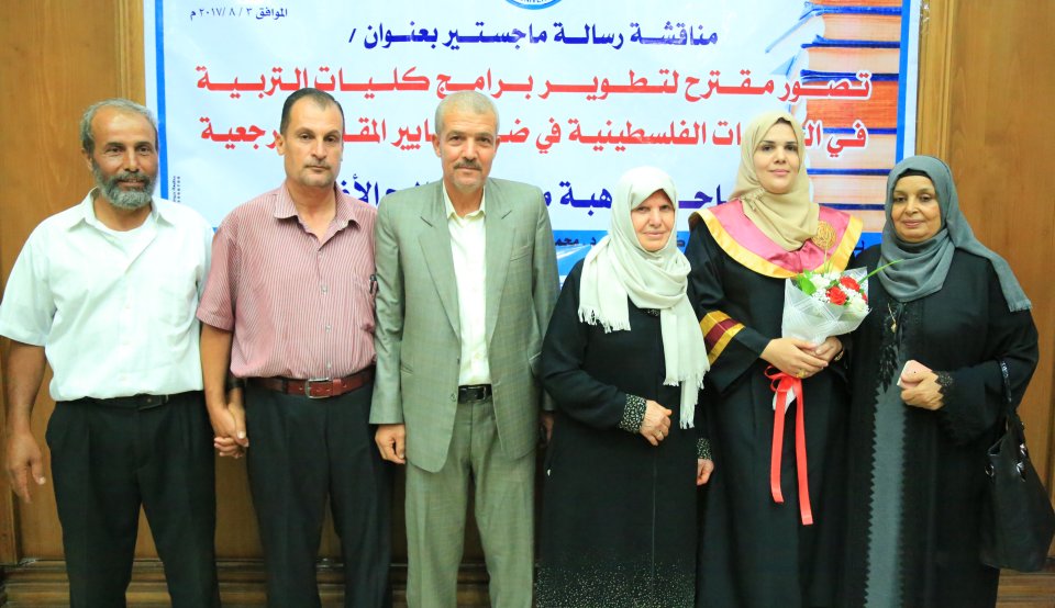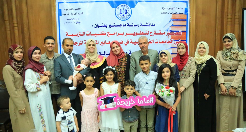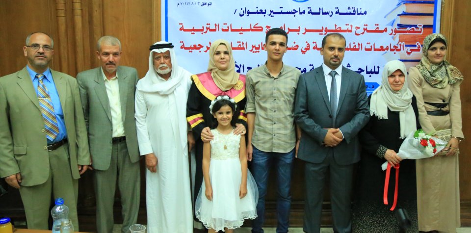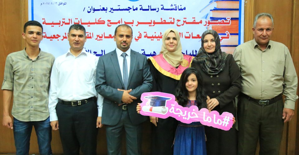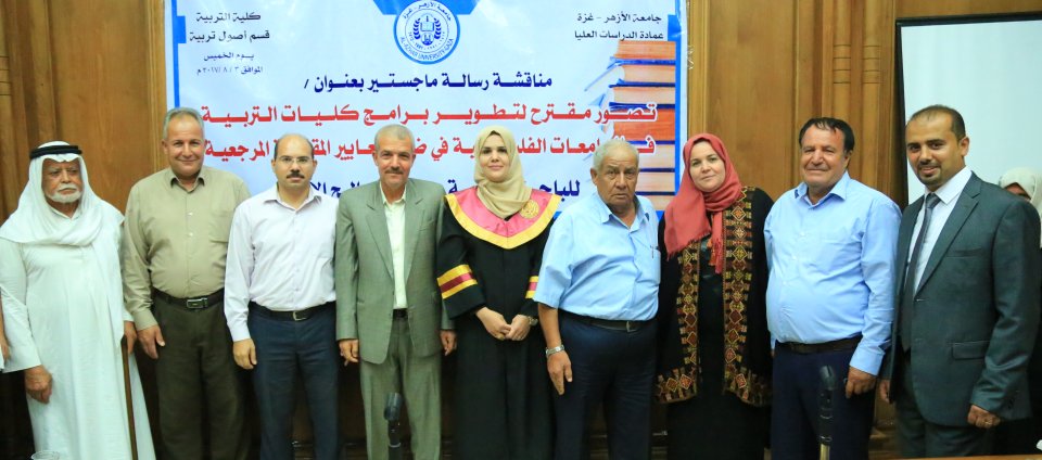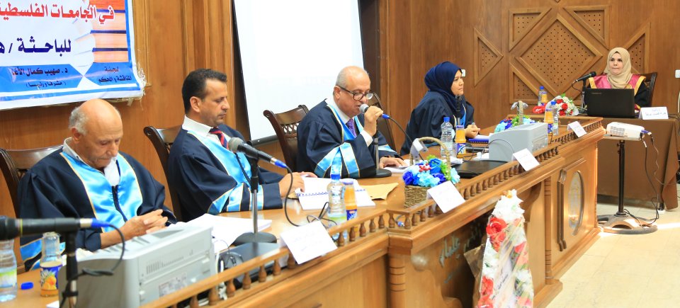 قاعة بيسان- جامعة الأزهر غزة- عمادة الدراسات العليا- كلية التربية- الخميس الموافق 3-8-2017، الباحثة هبة محمد صالح الاغا تنال درجة الماجستير في التربية- تخصص اصول التربية بعنوان:
