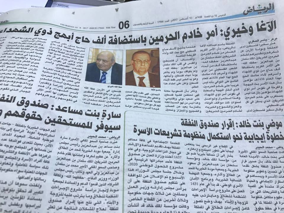 الرئيسة/متفرقات/صحيفة الرياض: الاغا وخيري: امر خادم الحرمين باستضافة الف حاج ابهج ذوي الشهداء متفرقات صحيفة الرياض: الاغا وخيري: امر خادم الحرمين باستضافة الف حاج ابهج ذوي الشهداء تاريخ النشر : الخميس | 10-08-2017 | 16:10 4234 اضغط هنا للتواصل أو التعرف على السفير باسم عبدالله يوسف حمدان الأغا يمكنك تلقي أحدث الأخبار أول بأول بانضمامك لإحدى مجموعات الواتساب الخاصة بالعائلة من خلال الضغط هنـا اظهر المزيد