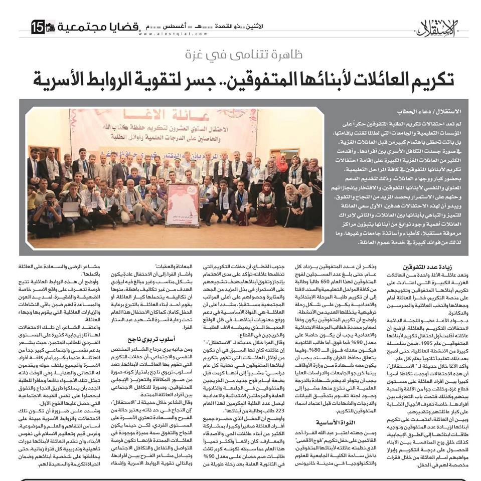 لم تعد احتفالات تكريم الطلبة المتفوقين حكراً على المؤسسات التعليمية والجامعات التي لطالما تغنت بإقامتها، بل باتت تحظى باهتمام كبير من قبل العائلات الغزية، في صورة جسدت التكافل الأسري بين أفرادها. وأقدمت الكثير من العائلات الغزية الكبيرة على إقامة احتفالات تكريم لأبنائها المتفوقين في كافة المراحل التعليمية، بحضور كبار ووجهاء العائلات، وذلك لتقديم الدعم المعنوي والنفسي لأبنائها المتفوقين، والافتخار بإنجازاتهم وحثهم على الاستمرار بحصد المزيد من النجاح والتفوق.