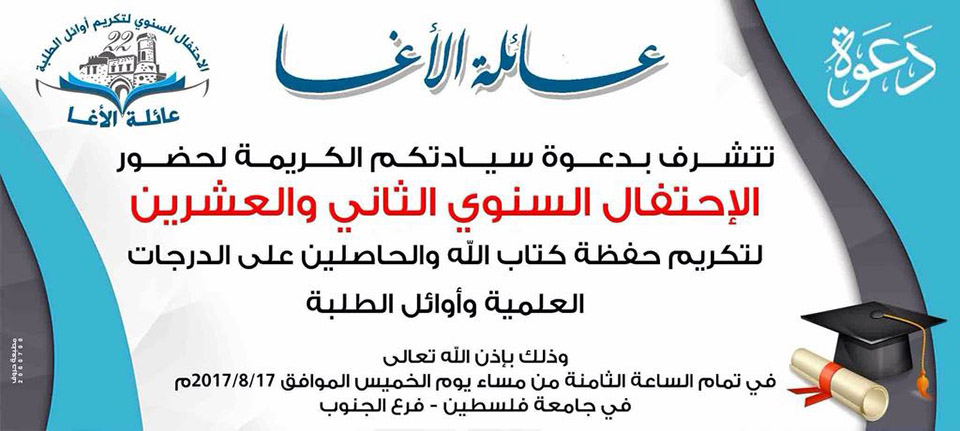 أما بخصوص حفل المرحلة الإبتدائية في تمام الساعة الثامنة من مساء يوم الجمعة الموافق 18-8-2017م، في جامعة فلسطين فرع الجنوب