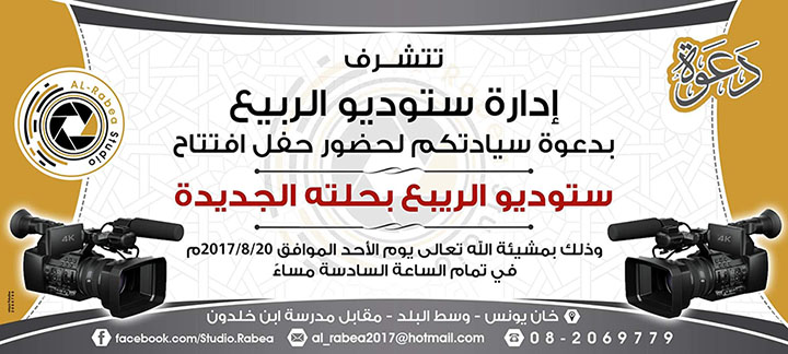 الرئيسة/متفرقات/خان يونس- دعوة لحضور إفتتاح ستوديو الربيع متفرقات خان يونس- دعوة لحضور إفتتاح ستوديو الربيع تاريخ النشر : الجمعة | 18-08-2017 | 17:53 7467 اضغط هنا للتواصل أو التعرف على السيد نادي محمد عبدالرحمن سعيد عبدالرحمن الأغا يمكنك تلقي أحدث الأخبار أول بأول بانضمامك لإحدى مجموعات الواتساب الخاصة بالعائلة من خلال الضغط هنـا اظهر المزيد