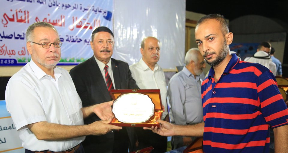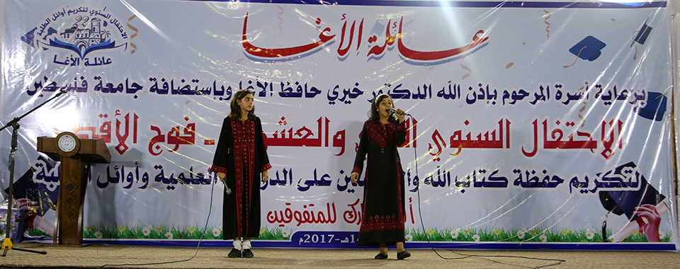 خان يونس- السطر الشرقي جامعة فلسطين فرع الجنوب الخميس والجمعة الموافق 17،18 أغسطس لعام 2017، بعون الله وتوفيقه انهت العائلة احتفالات تكريم ابنائها الناجحين والمتفوقين (الفوج الثاني والعشرون فوج الأقصى) بدءا من الحاصلين على السند المتصل والحافظين لكتاب الله والحاصلين على الدكتوراه والماجستير والبكالوريوس والثانوية العامة وحتى الصف الأول الأساسي، والبالغ عددهم 630 متفوقا. والحاصلين على معدل 90% وما فوق أما طلبة التوجيهي الحاصلين على معدل 80%وما فوق.