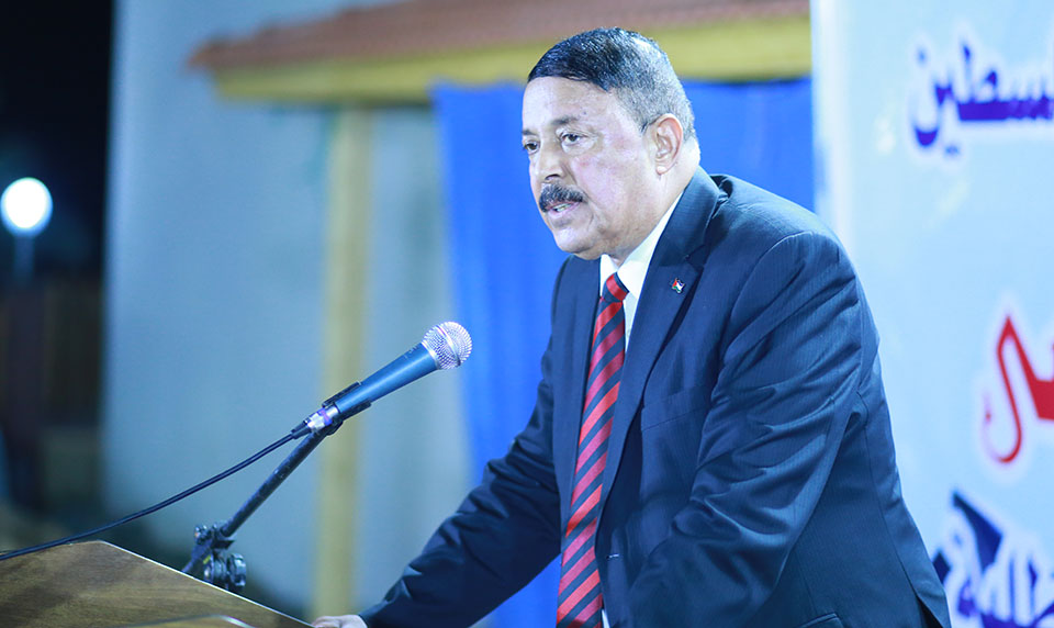 الأستاذ أبورامي عمر عودة الأغا متحدثا بالنيابة عن راعي الاحتفال أسرة د. خيري الاغا يرحمه الله