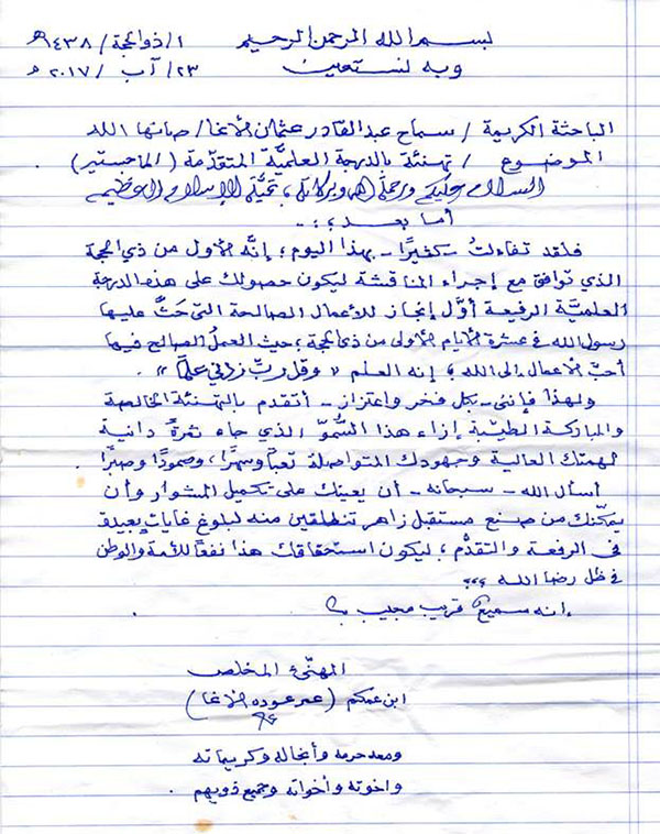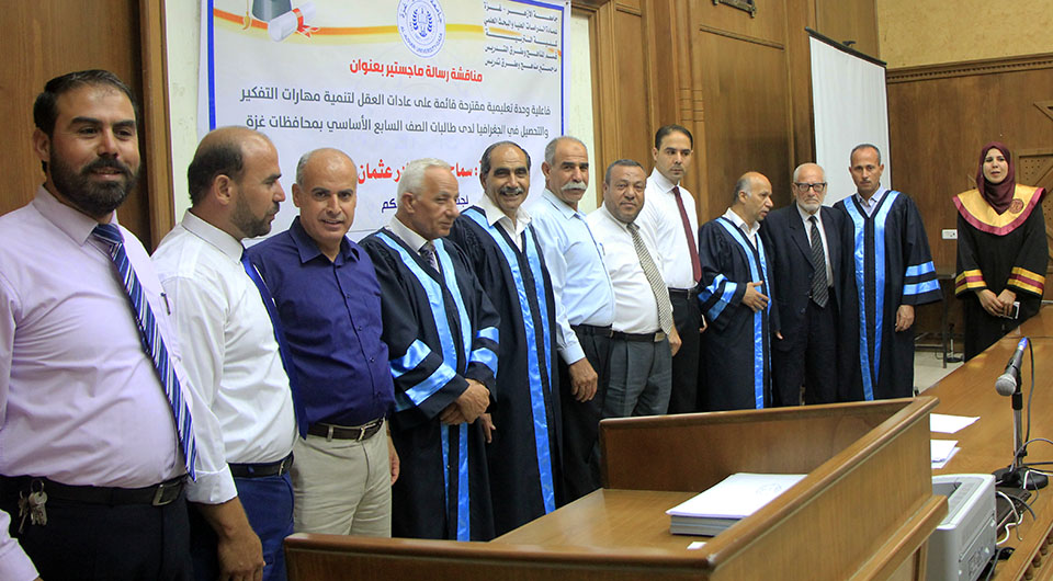 أ.د خليل حماد، أ. عمر عودة، د. وائل العاصي، د. مروان سليم، د. محمد عليان، د. عبد الكريم لبد، د. محمد أغا، الحاج عبد القادر(والد الباحثة)، الباحثة