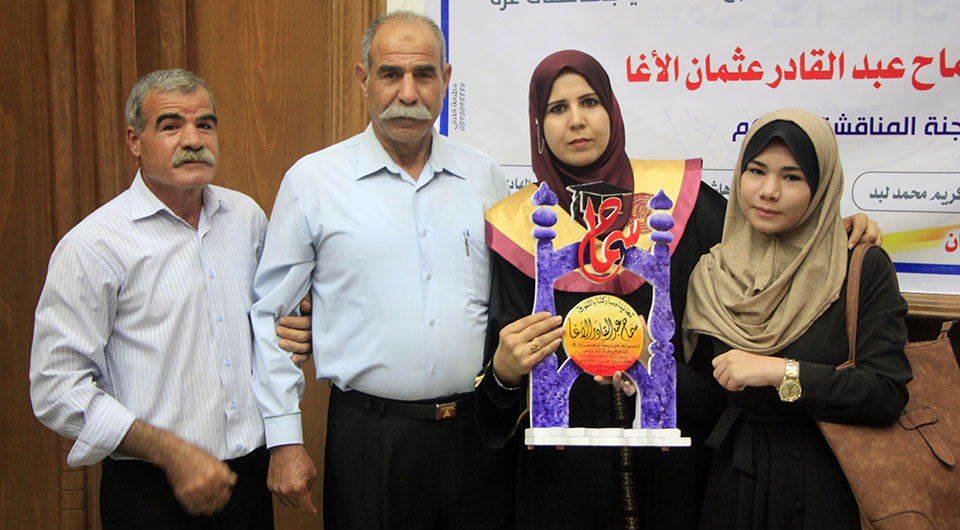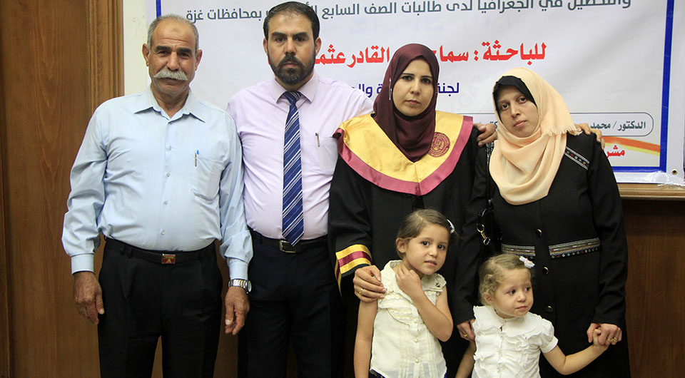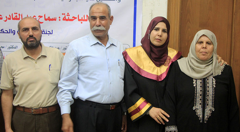 الباحثة تتوسط والديها، أ. ابو أنس الشوا