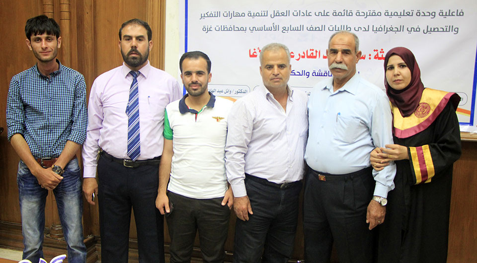 د. وائل العاصي، أ. عمر عودة، د. عبد الكريم لبد، الباحثة ووالدها، أ. أسامة الشوا، د. محمد عليان، د. محمد أغا، الحاج سعيد الأغا، أ. ابو أنس الشوا