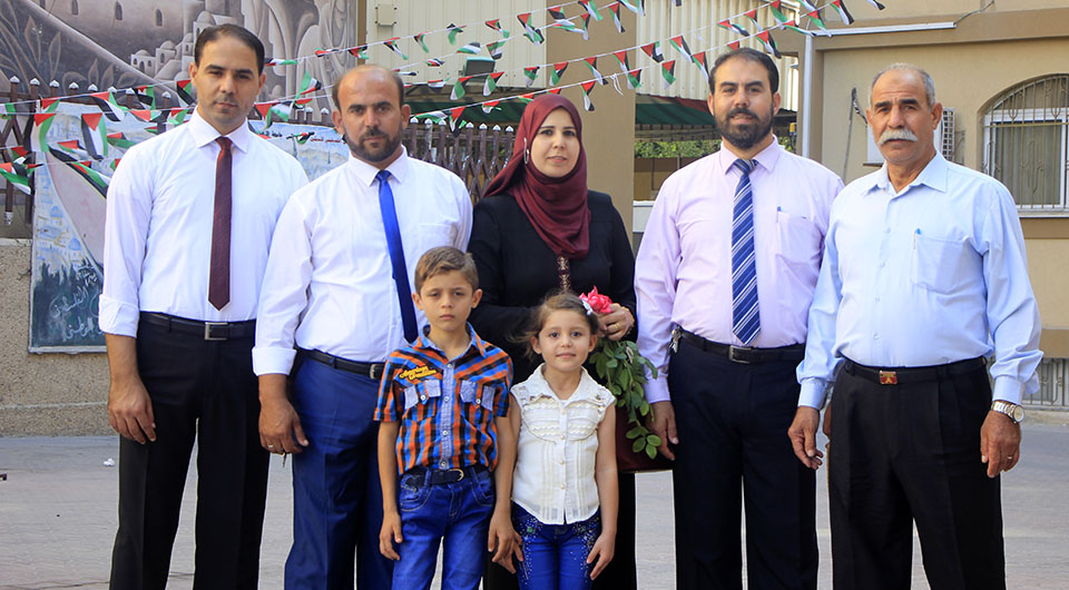 أ. أمل محمد الأغا ونجلها سعيد، الحاجة نهى(والدة الباحثة)، الباحثة، والد الباحثة، أ. عبد المنعم العالول، أ. محمد عبد القادر(شقيق الباحثة)، أ. عماد سعيد وشقيقه إياد