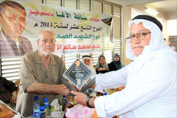 شكراً لعائلتي، وشكراً لعميدنا الكبير العم أبو أحمد وديع أحمد الأغا عميد ومختار العائلة وشكراً لجامعة فلسطين ولعميدها الأخ المهندس عماد خالد الأغا أبو خالد رئيس جامعة فلسطين وشكراً لأبناء المرحوم الحاج خيري حافظ عثمان الأغا علي رعايتهم وتمويلهم للحفل، ولن أنسي تقديم الشكرأ للجنة المنظمة و المشرفة علي إحتفالات هذا العام بتكريم فوج الأقصي من أبناء عائلتنا ــ الذين حفظوا القرآن كاملاً والذين حصلوا على درجة الدكتوراه والماجستير والبكالوريوس والثانوية العامة مروراً بصفوفها والأعدادية وصفوفها و الأبتدائية حتى صفها الأول ــ علي كرمهم وتكريمهم لأبنائنا المتفوقين و المميزين كلٌ بإسمه و أخص بالذكر أحفادي : فــرح و محمد أبناء إبننا علي محمد سالم رحمه الله و الذي أكرمتموه بتسمية الفوج التاسع عشر بإسمه في كثل هذا اليوم قبل أربع سنوات 25 أغسطس أب 2013 ...