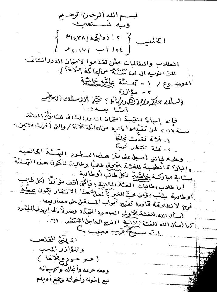 الرئيسة/متفرقات/تهنئة عامة خاصة ومؤازرة متفرقات تهنئة عامة خاصة ومؤازرة تاريخ النشر : الجمعة | 25-08-2017 | 23:30 4568 اضغط هنا للتعرف على المرحوم أ. عمر عودة إسعيد محمد سالم إبراهيم(بدوي) الأغا يمكنك تلقي أحدث الأخبار أول بأول بانضمامك لإحدى مجموعات الواتساب الخاصة بالعائلة من خلال الضغط هنـا اظهر المزيد