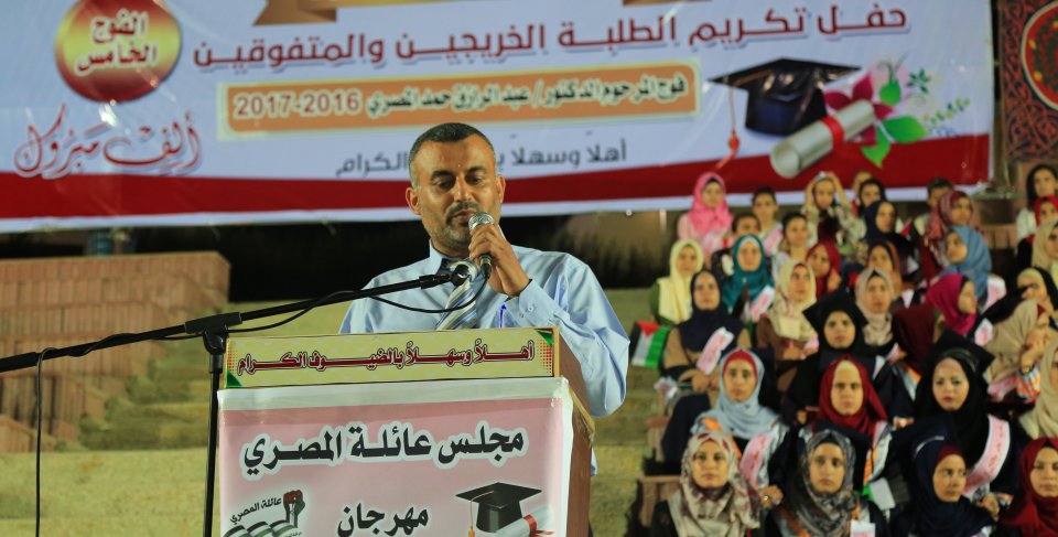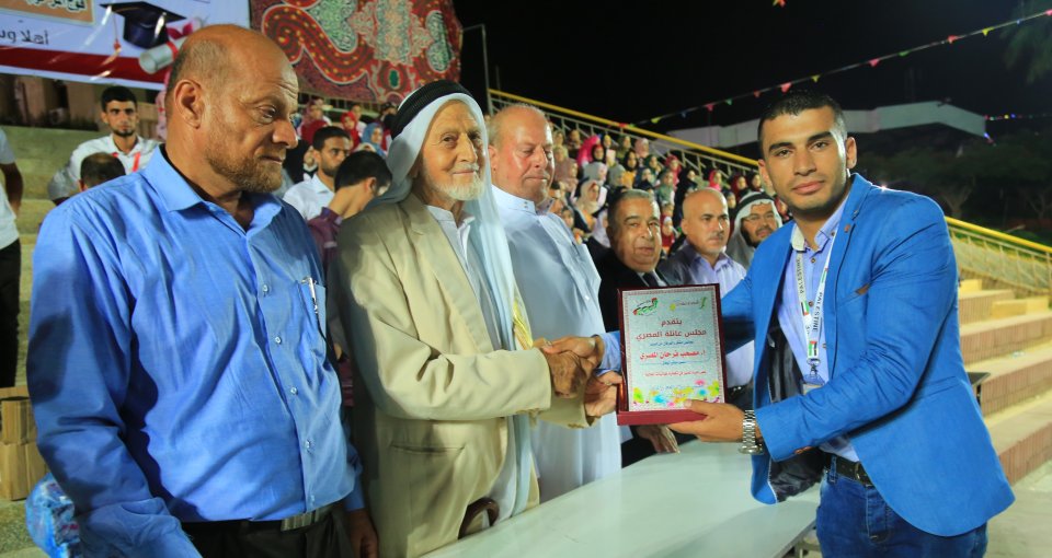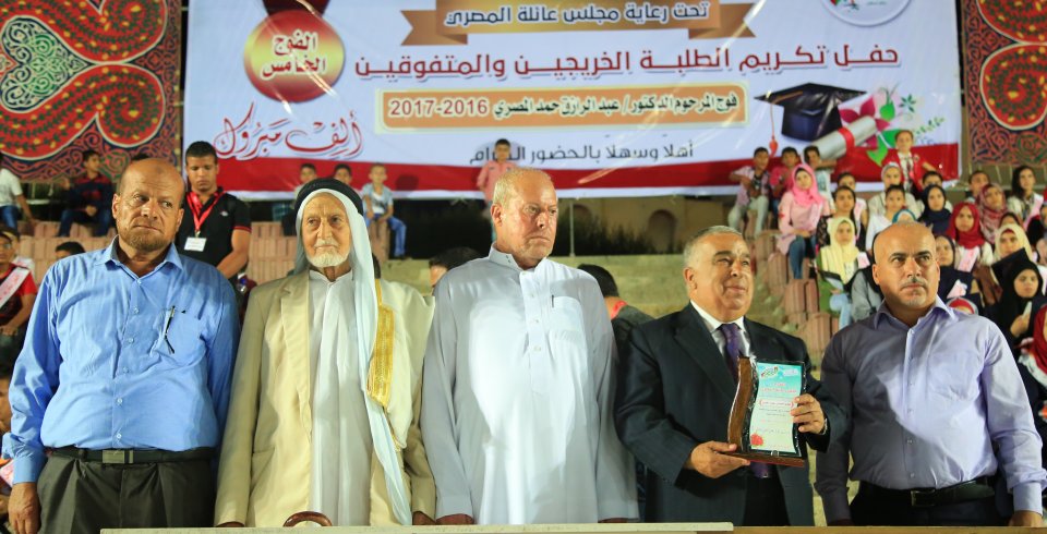 خان يونس- كلية العلوم والتكنولوجيا عائلة المصري تكرم ابنائها الناجحين والمتفوقين (فوج الدكتور المرحوم عبدالرازق حمد المصري) بدءا من الحافظين لكتاب الله وانتهائا بالطلبة الاعدادية، ولانه من الواجب شكر كل من ساهم في الحضور و الاستضافة والتخطيط والتنفيذ (ووجهاء العائلة) واستضافة عدد من المخاتير والوجهاء من كافة عائلات المحافظة علي رأسهم المحافظ أحمد الشيبي، وقد عبر الطلبة المتفوقين وذويهم عن سعادتهم وفخرهم بانجازاتهم .