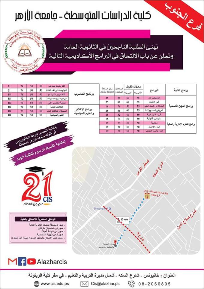 جامعة الأزهر– فرع الجنوب– استقبال الطلبة الناجحين في الثانوية العامة والحاصلين على معدل 50% فما فوق. وقال عميد الكلية د.حازم سكيك في تصريح لـه أن افتتاح مقر الكلية في جنوب قطاع غزة يعد إضافة نوعية ومتميزة لدعم جهود الكلية في السير قدما نحو تحقيق المزيد من أهدافها.