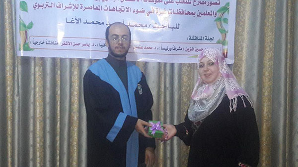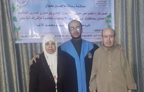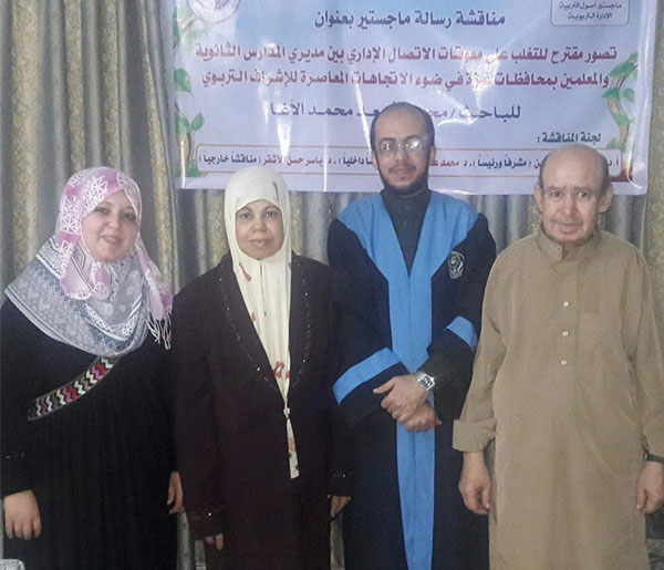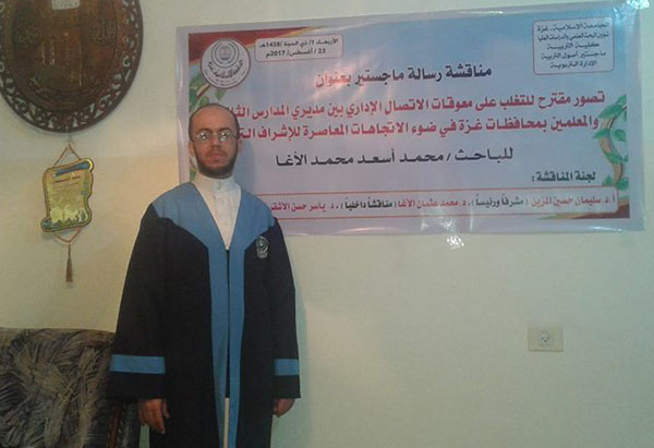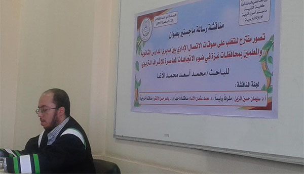 الجامعة الإسلامية –خان يونس-فرع الجنوب- قاعة الإجتماعات- الأربعاء الموافق 23/08/2017م - 01/ذى الحجة/ 1438هـ الساعة الواحدة ظهرا حصول الباحث الشيخ/ محمد أسعد محمد الأغا على درجة الماجستير في أصول التربية /الإدارة التربوية بعنوان : تصور مقترح للتغلب على معوقات الاتصال الإداري بين مديري المدارس الثانوية والمعلمين بمحافظات غزة في ضوء الاتجاهات المعاصرة للإشراف التربوي، وألف مبارك