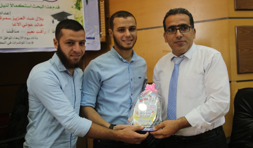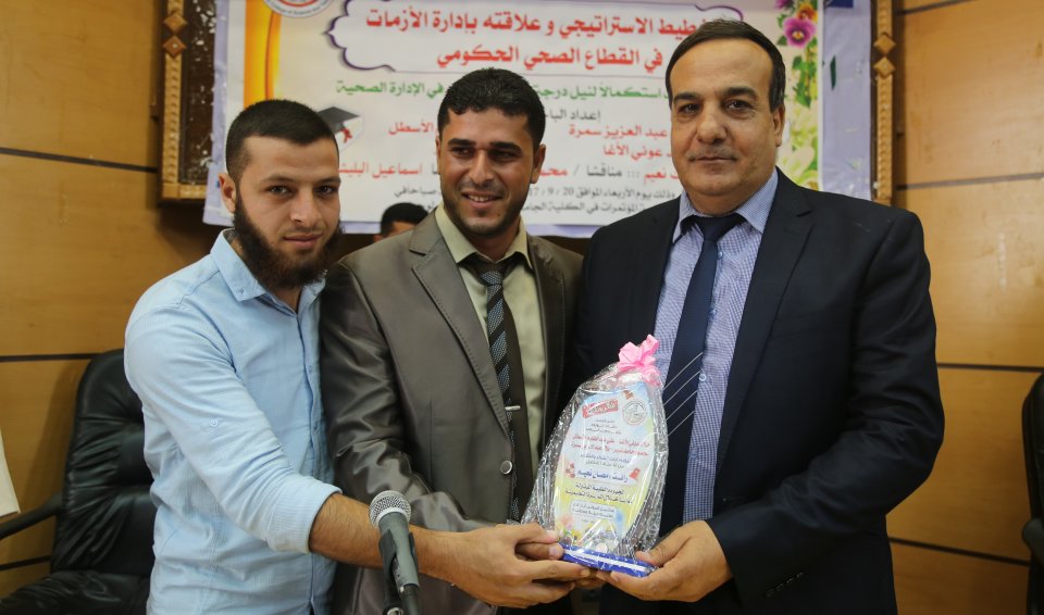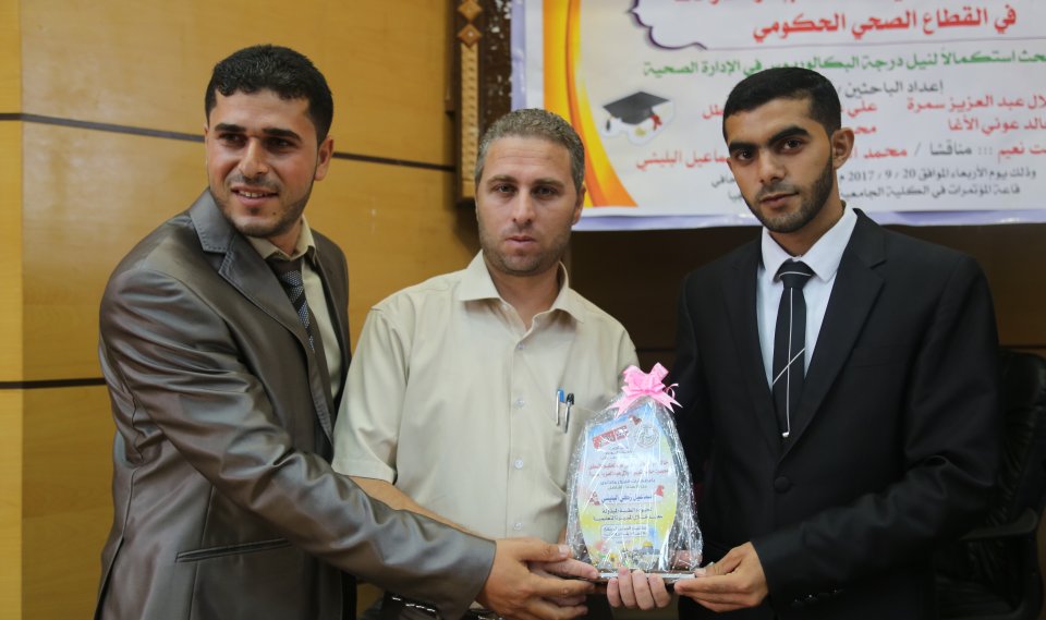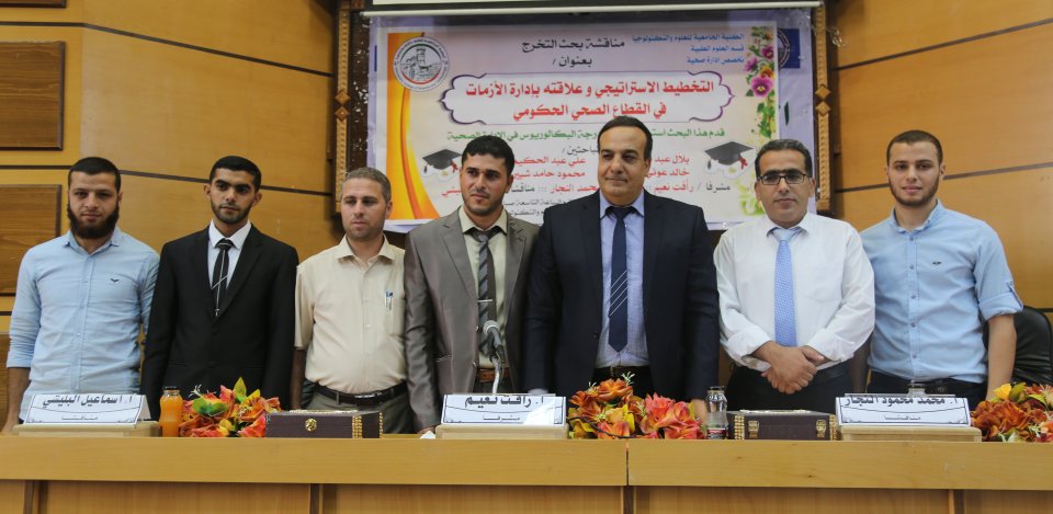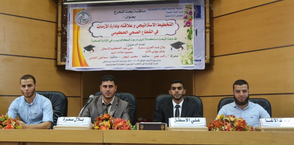 خان يونس- الكلية الجامعية للعلوم والتكنولوجيا الأربعاء 20-09-2017 تم بحمد الله وتوفيق مناقشة مشروع تخرج للطالب خالد عوني الأغا تخصص إدارة صحية بعنوان التخطيط الإستراتيجي وعلاقته بإدارة الأزمات فس القطاع الصحي الحكومي، بتقدير عام إمتياز، وألف مبارك.