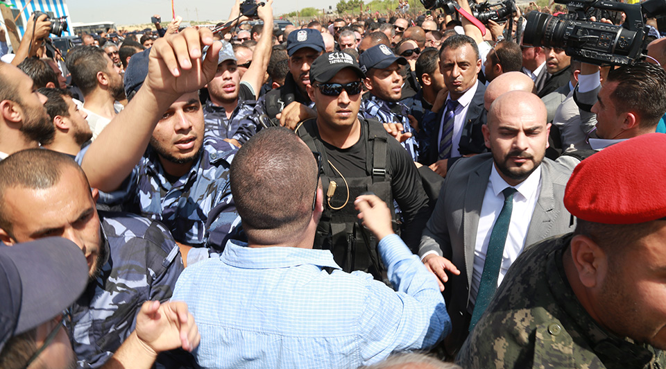 ولم تمنع الإجراءات الأمنية المشددة زحف آلاف المواطنين من مختلف الأعمار الى المكان المخصص لاستقبال الوفد الحكومي، رافعين صور الرئيس محمود عباس والرئيس الشهيد ياسر عرفات ورئيس الوزراء، إضافة الى صور الرئيس المصري عبد الفتاح السيسي.