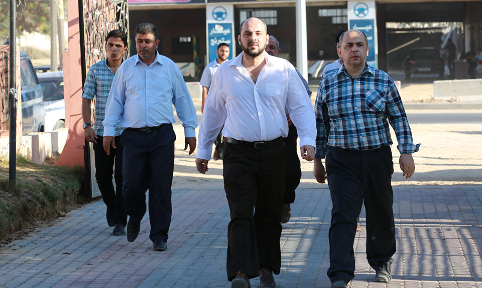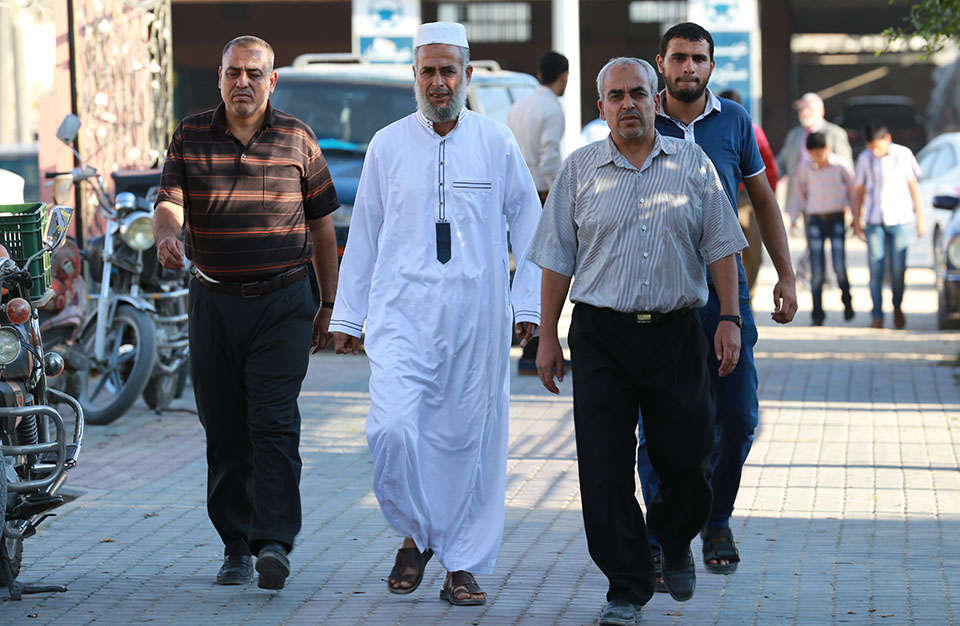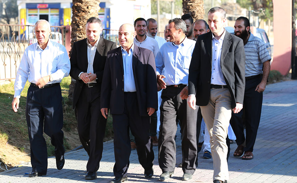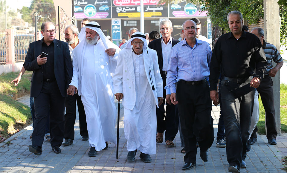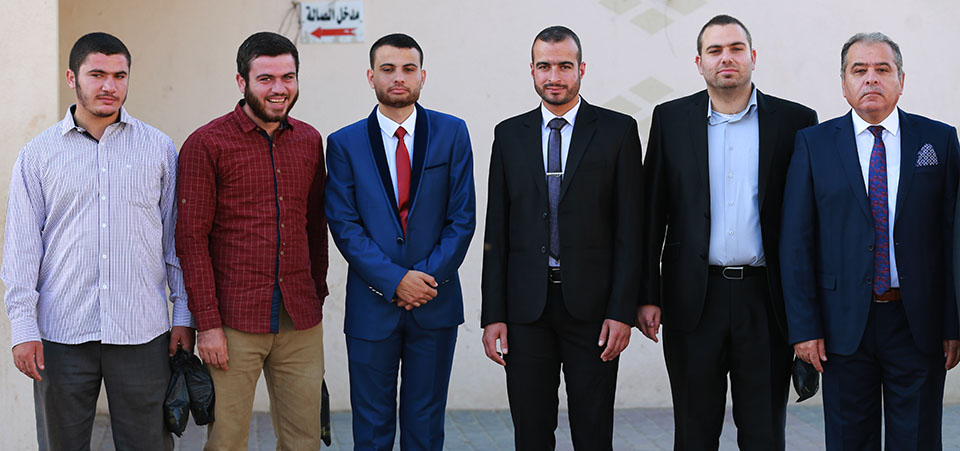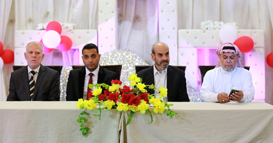 الشيخ إحسان عاشور(مفتي محافظة خانيونس)، أ. عبد اللطيف عاشور( والد العريس)، العريس، أ. د. عبد المعطي الأغا(والد العروس)