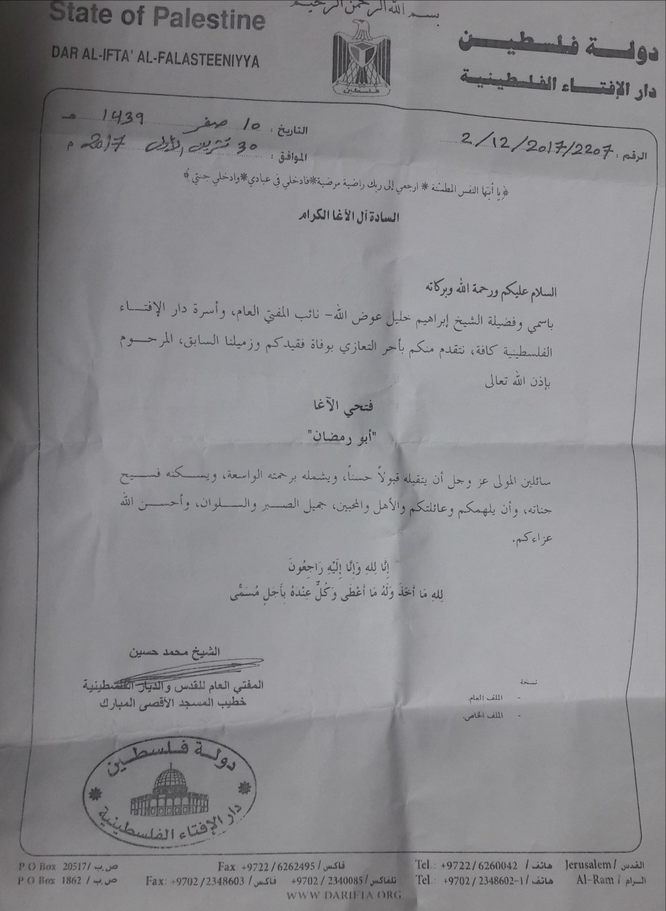 المرحوم بإذن الله الحاج رمضان محمد حمدان الأغا إنتقل إلى رحمة الله تعالى بتاريخ 1997-02-21