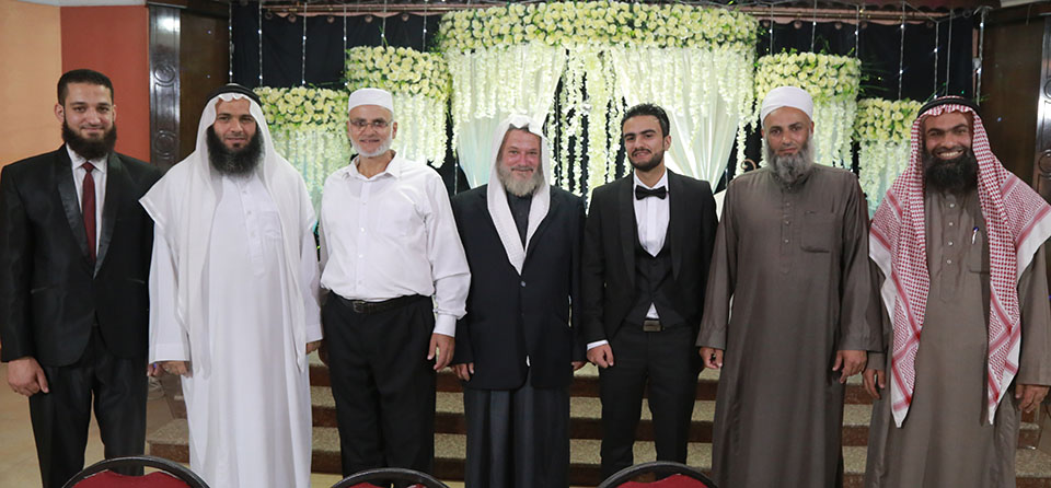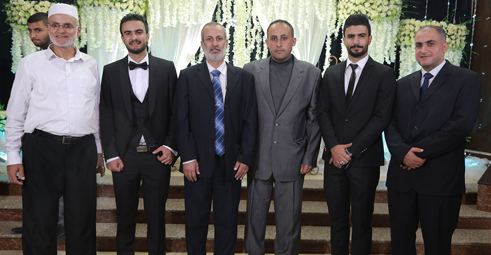 الشيخ إبراهيم الأسطل، الشيخ منهل الأغا(عم العريس)، العريس، الحاج سعيد سليمان وادي، أ. منير(عم العريس)، الشيخ حمدان شراب، أ. عبدالرحمن وادي(شقيق العروس)