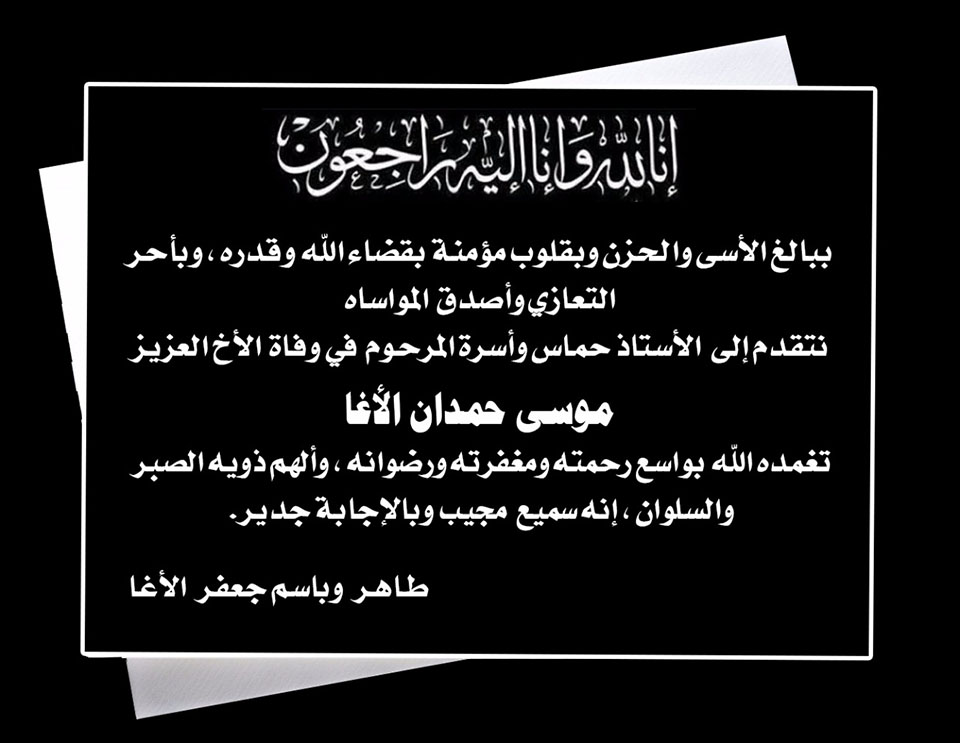 بسم الله الرحمن الرحيم (( يَا أَيَّتُهَا النَّفْسُ الْمُطْمَئِنَّةُ ارْجِعِي إِلَى رَبِّكِ رَاضِيَةً مَرْضِيَّةً فَادْخُلِي فِي عِبَادِي وَادْخُلِي جَنَّتِي )) ببالغ الحزن والأسى ننعى إليكم نبأ وفاة الحاج المغفور له / موسى حمدان الأغا(أبو حمدان)الذي وافته المنية في قطاع غزة فلسطين. تقبل التعازي للرجال في مجلس العزاء بفندق سنترو المنهل روتانا - القاعة بالطابق الثاني - شارع الشيخ راشد بن سعيد(شارع المطار) - أبوظبي. وذلك يومي السبت والأحد الموافق 25,26 /11/2017 وذلك بعد صلاة المغرب. المواقف متوفرة بالفندق أو في مبنى المواقف التابع للوحدة مول بخلف الفندق مباشرة.