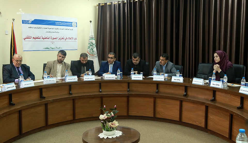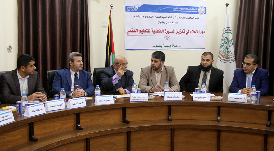 نظم قسم العلاقات العامة بالكلية الجامعية للعلوم والتكنولوجيا بخان يونس وبالشراكة مع صحيفة فلسطين ورشة عمل بعنوان دور الإعلام في تعزيز الصورة الذهنية للتعليم التقني بحضور خبراء ومختصون في مجال الإعلام من مختلف المؤسسات الإعلامية في الساحة الفلسطينية.