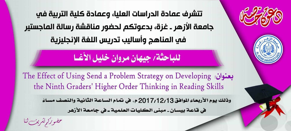 تتشرف عمادة الدراسات العليا، وعمادة كلية التربية في جامعة الازهرغزة، بدعوتكم لحضور مناقشة رسالة الماجستير في المناهج وأساليب تدريس اللغة الانجليزية للباحثة جيهان مروان خليل الأغا.