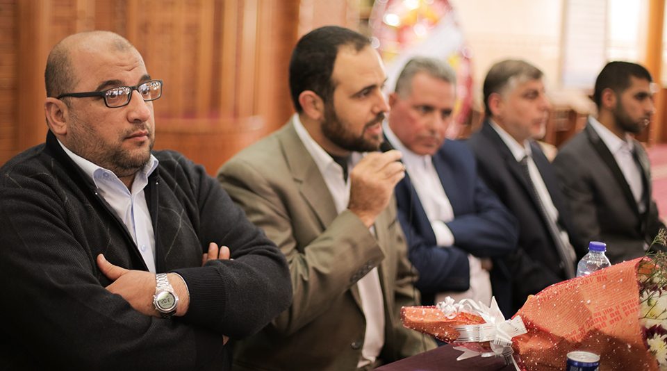 محمود شعت ، هشام الأغا ، العريس ، حذيفة النجار (ابن عم العروس) ، محمود (شقيق العريس) ، جميل (شقيق العريس) ، عبادة النجار (ابن عم العروس)، عبد الله صادق ، كامل العقاد ، عصام وادي (والد العريس) ، زهير كلخ