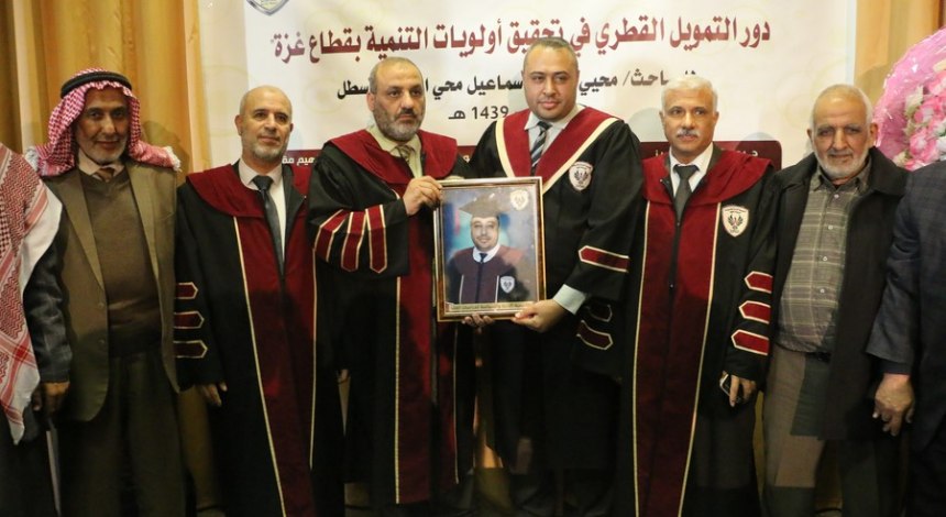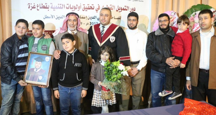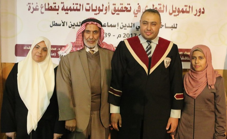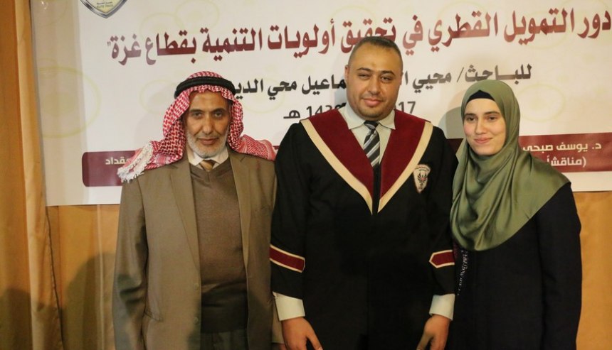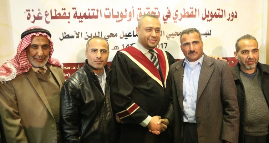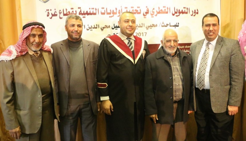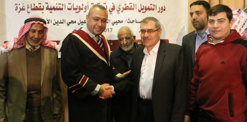 غزة مركز رشاد الشوا الأربعاء 3-1-2018 بفضل الله وتوفيقه حصل الباحث الفاضل أ. محيي الدين إسماعيل محيي الدين "فايز" الأسطل على درجة الماجستير في الإدارة والقيادة من أكاديمية الإدارة والسياسة بالتعاون مع جامعة الأقصى وقد كانت رسالته بعنوان دور التمويل القطري في تحقيق أولويات التنمية بقطاع غزة، وألف ألف مبارك.