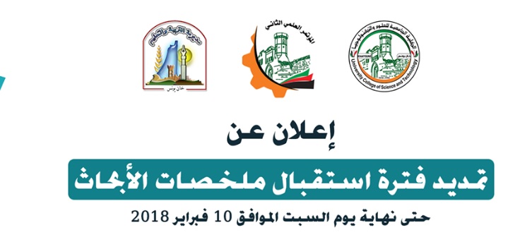 بنــــاءً على رغبـــــة العديـــــد مــــن الباحثيـن والمؤسسات التعليمية وتقديرًا لظروف الكهرباء، تعلـن اللجنـــــة التحضيريــــــة للمؤتمــــر العلمـــــــي الثانـــــــي، مستقبل التعليم المهني والتقني بمدارس التعليم العام في فلسطين. عن تمديد فترة استقبال ملخصات الأبحاث حتى نهاية يوم السبت الموافق 10 فبراير 2018.