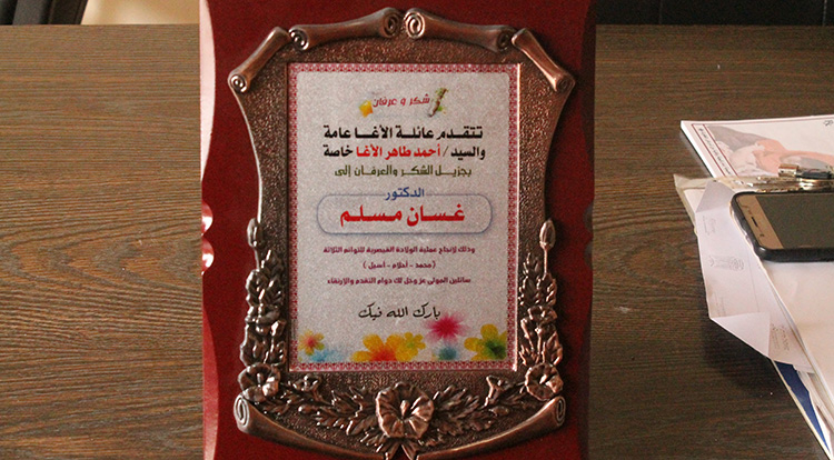 بأسمى آيات الشكر ووافر عبارات الامتنان تتقدم أسرة السيد/ أحمد طاهر الأغا من الدكتور غسان مسلم على جهوده الطيبة المباركة التي بذلها في رعاية ومتابعة زوجتي اثناء حملها الى أن تكلل أمرها الحمد لله بالوضع الميمون، فلقد أمتزج اخلاصكم في عملكم وكفاءتكم الطبية برعايتكم الكريمة وجهدكم المتميز حتى اصبحت حياة زوجتي وابناءنا في مأمن الله بفضله ومن ثم بفضل عطاءكم.