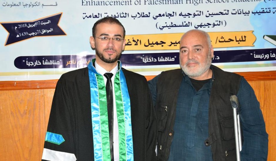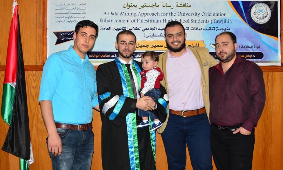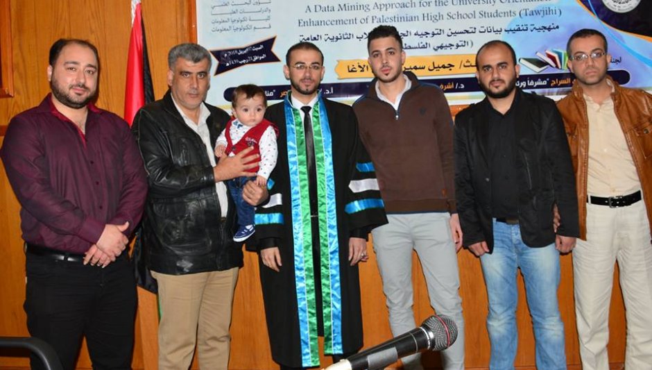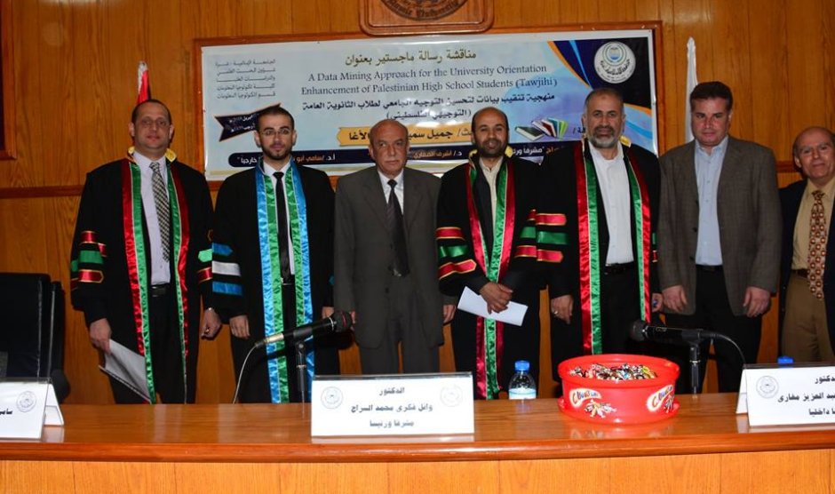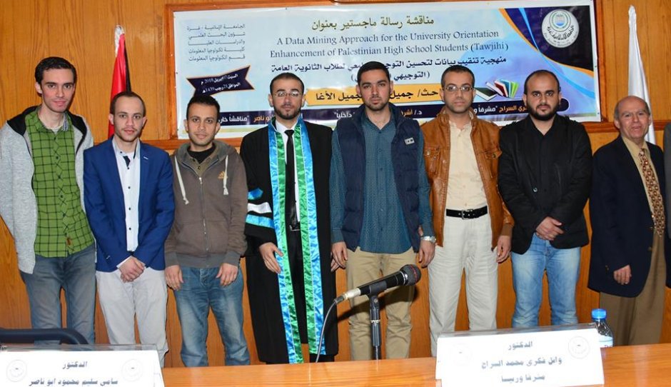 قاعة المؤتمرات مبني القدس بالجامعة الاسلامية - السبت الموافق 07-04-2018 تم بحمدالله وتوفيقه مناقشة رسالة الماجستير في تكنولوجيا المعلومات للباحث جميل سمير الاغا، بعنوان منهجية تنقيب بيانات لتحسين التوجيه الجامعي لطلاب الثانوية العامة (التوجيهي الفلسطيني) Research Title: A Data Mining Approach for the University Orientation Enhancement of Palestinian High School Student (Tawjihi)، وقد أوصت اللجنة المكونة من د. وائل السراج مشرفا ورئيسا، د. أشرف المغاري مناقشا داخليا، ا.د. سامي أبو ناصر مناقشا خارجيا، بمنح الباحث درجة الماجستير في تخصص تكنولوجيا المعلومات من الجامعة الاسلامية، وألف مباركـــــ.