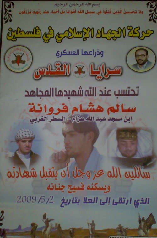 الذي انتقل الى رحمة الله تعالى، عن عمر يناهز 20عاما، خان يونس، صباح السبت الموافق 02-05-2009، بعد اصابته إثر حادث تصادم ثلاث دراجات نارية في شارع البحر منطقة المواصي الموازية للسطر الغربي، رحم الله الفقيد رحمة واسعة واسكنه فسيح جناته.
