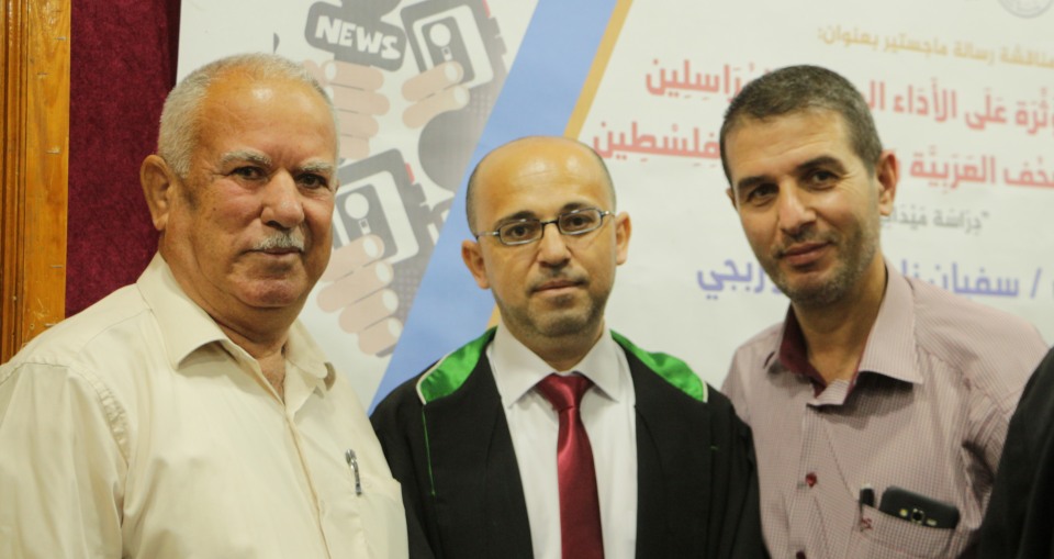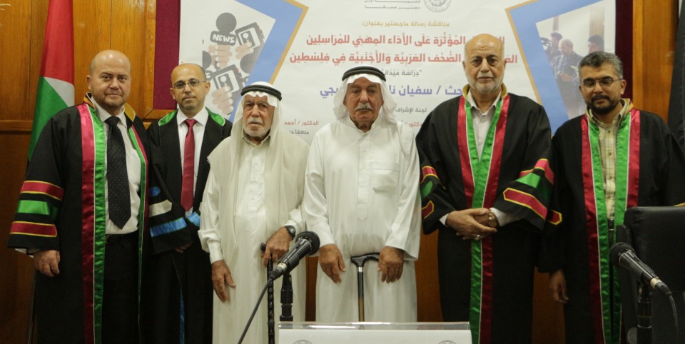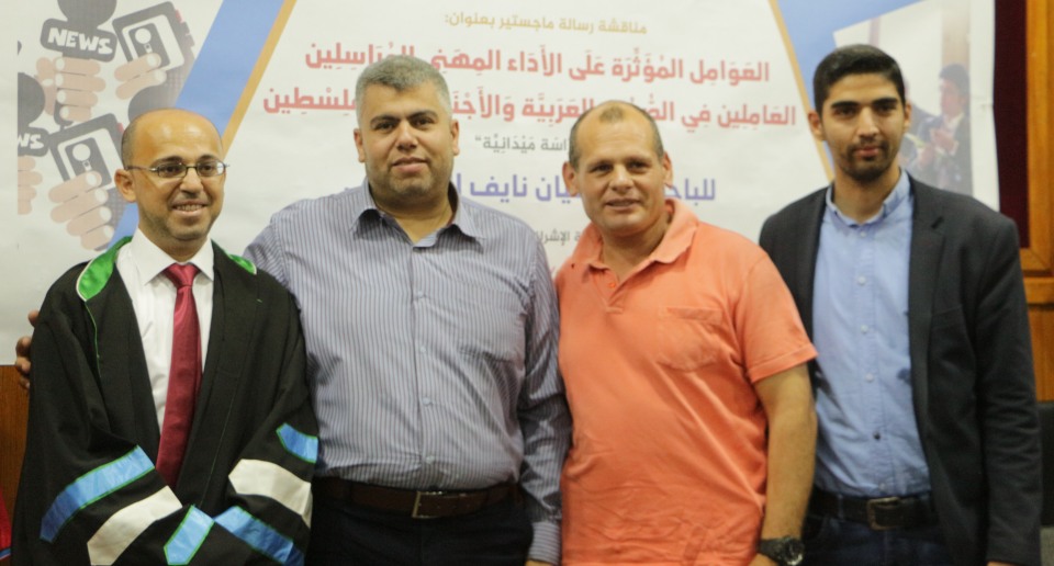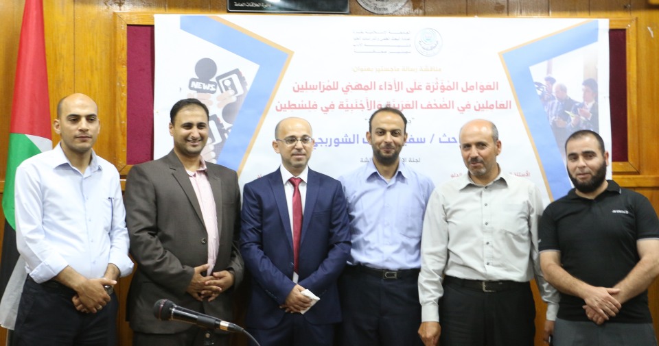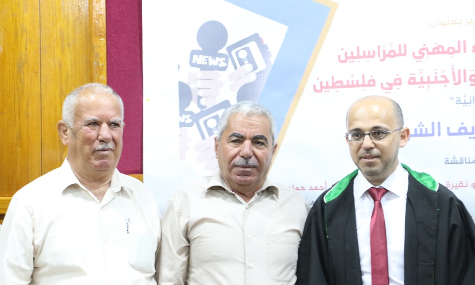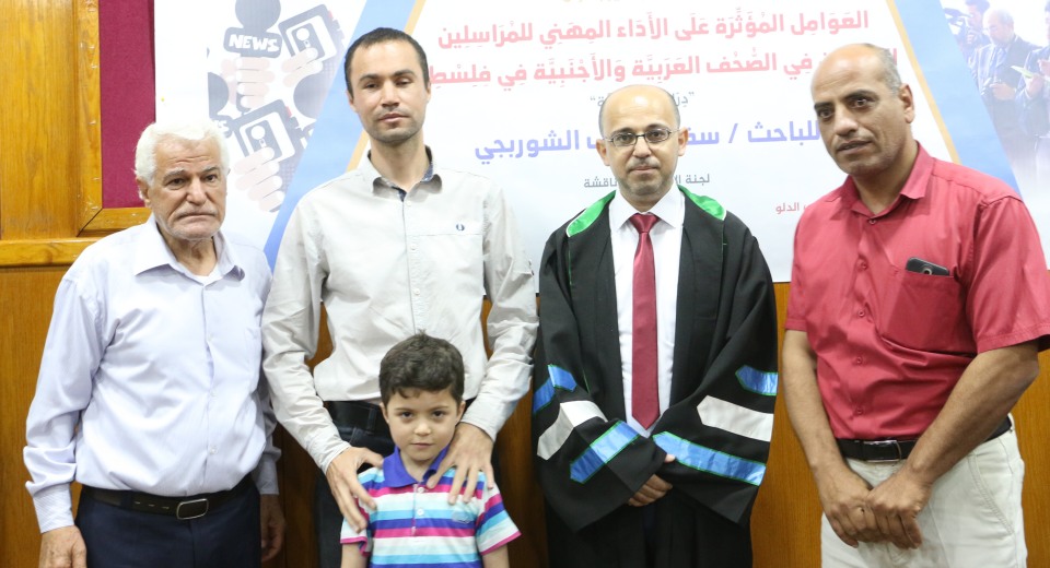 منح الباحث سفيان نايف حمدان الشوربجي درجة الماجستير في الصحافة عن أطروحته الموسومة بعنوان" العوامل المؤثرة على الاداء المهني للمراسلين العاملين في الصحف العربية والأجنبية في فلسطين" دراسة ميدانية والتي عقدت في مبنى طبية بالجامعة الاسلامية الاربعاء الموافق 23/5/2018، وتكونت لجنة المناقشة من الاستاذ الدكتور جواد راغب الدلو مشرفاً ورئيساً، الدكتور أيمن أبو نقيرة مناقشاً داخلياً، الدكتور أحمد حماد مناقشاً خارجياً