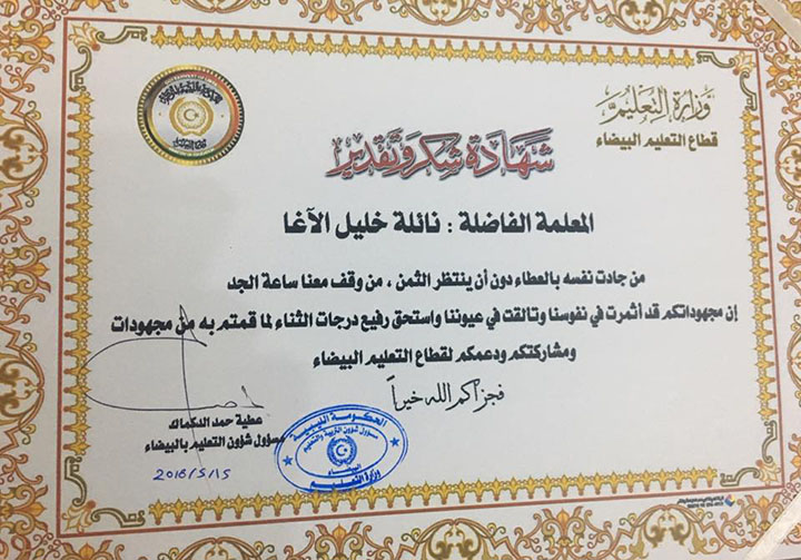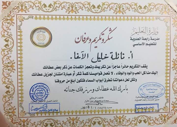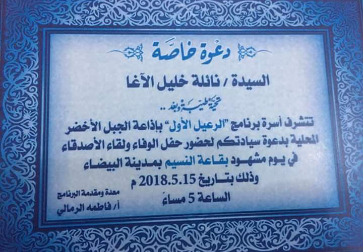 ليبيا- مدينة البيضاء 15-05-2018- أقامت إذاعة الجبل الأخضر احتفالاً كبيراً تكريماً للرعيل الأول من المعلمين الذين جادوا بالعمل والعطاء لفترة طويلة فى سلك التعليم، حيث تم تكريم 42 معلماً من بينهم خمس معلمين عرب وهم: