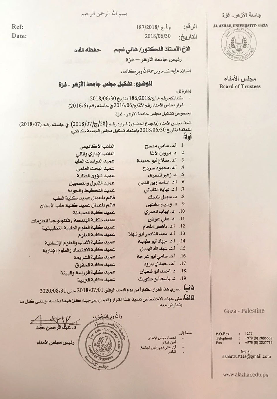تم تجديد الثقة للدكتور مروان سليم الأغا كـ نائب رئيس الجامعة للشؤون الإدارية والمالية لعضوية الدورة الجديدة لمجلس الجامعة والف مبارك