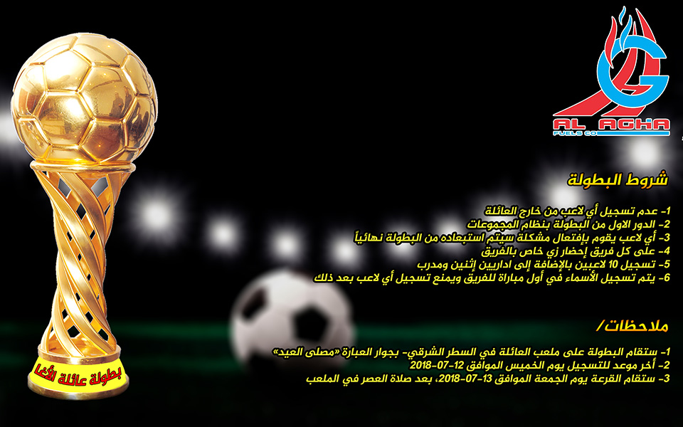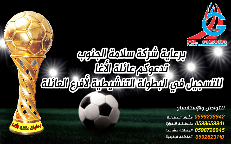 الرئيسة/رياضة/دعوة للتسجيل في البطولة الكروية التنشيطية للعائلة رياضة دعوة للتسجيل في البطولة الكروية التنشيطية للعائلة تاريخ النشر : الأربعاء | 04-07-2018 | 22:38 4463 دعوة للتسجيل في البطولة الكروية التنشيطية لعائلة الأغا، برعاية شركة سلامة الجنوب. يمكنك تلقي أحدث الأخبار أول بأول بانضمامك لإحدى مجموعات الواتساب الخاصة بالعائلة من خلال الضغط هنـا اظهر المزيد