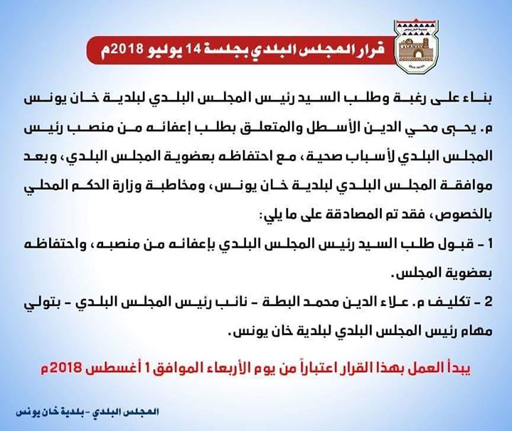 تكليف م. علاء الدين محمد البطة رئـيـساً للـمجـلـس الـبـلدي لـبـلـديـة خـان يـونـس، وألـف مـبـارك