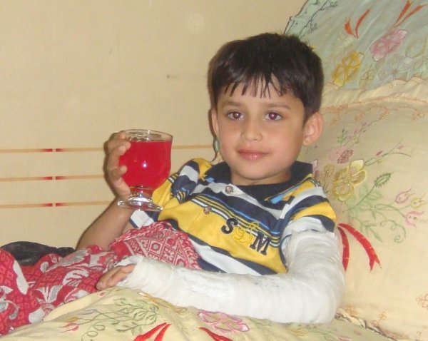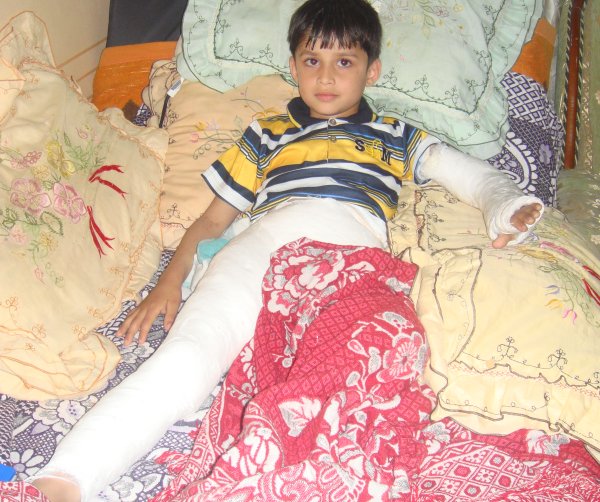 صورة للطفل اسلام ويظهر فيها أثار الكسور اليد اليسرى والحوض والرجل اليمنى