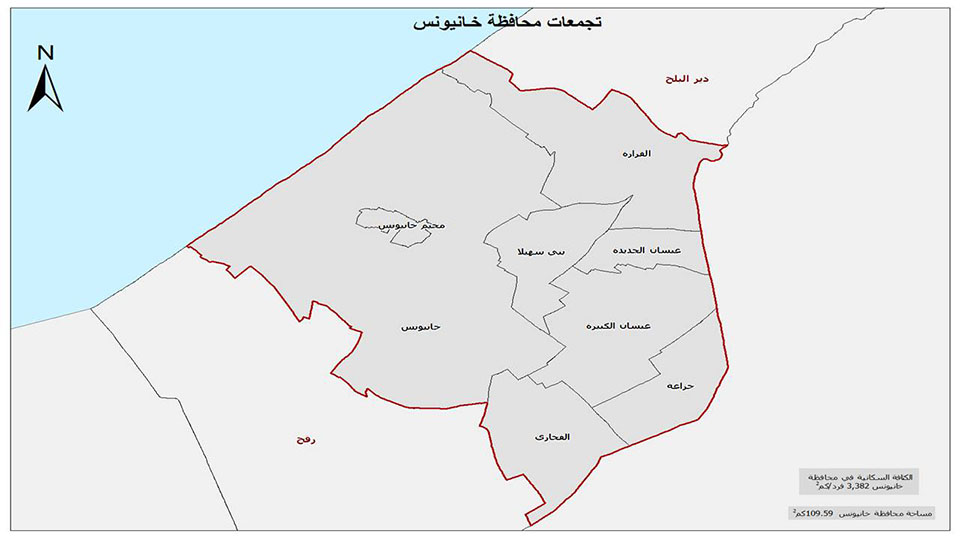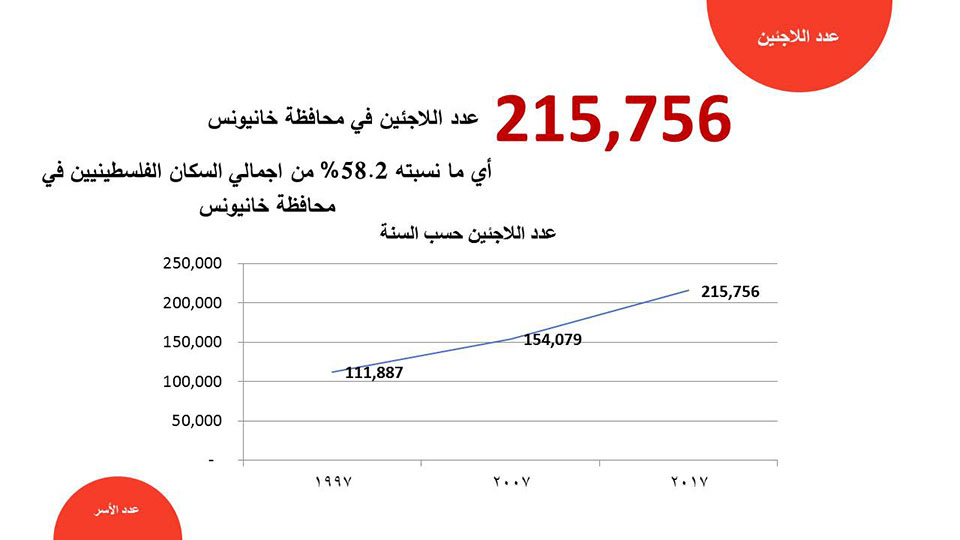 وأشار قحمان أن نسبة الذكور تشكل 50.7% ، بينما شكلت نسبة الإناث 49.3%، ويبلغ عدد اللاجئين في محافظة خانيونس 215,756، أي ما نسبته 58.2% من اجمالي السكان الفلسطينيين في محافظة خان يونس