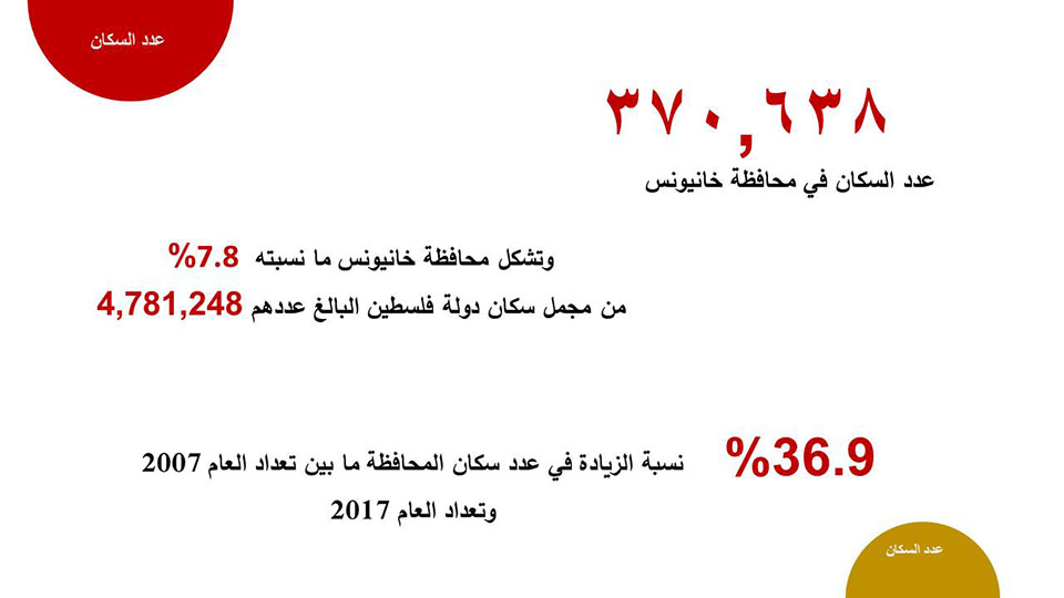 بينما استعرض مدير تعداد محافظة خان يونس محمد قحمان النتائج النهائية للتعداد في المحافظة، موضحاً أن عدد السكان بلغ 370,638ـ وتشكل محافظة خان يونس ما نسبته %7.8 من مجمل سكان دولة فلسطين البالغ عددهم 4,781,248.