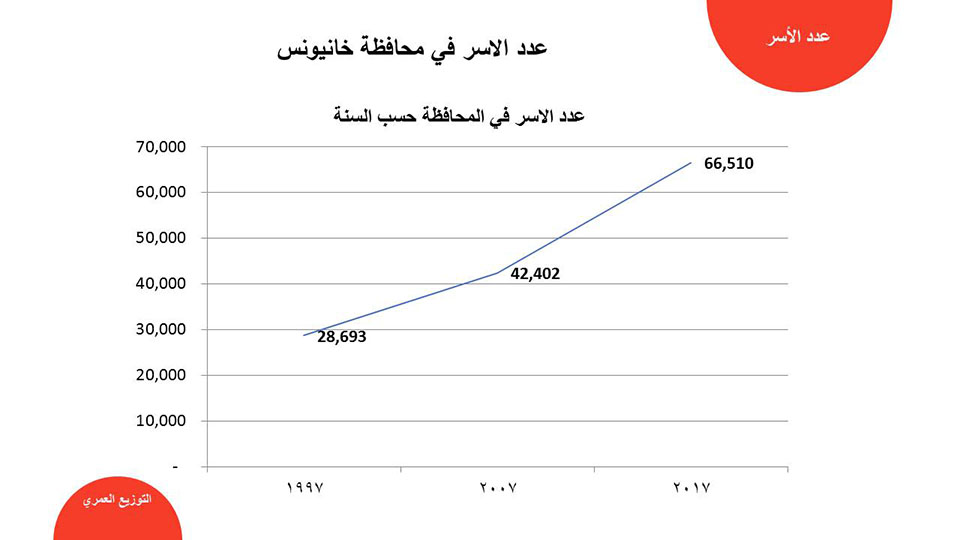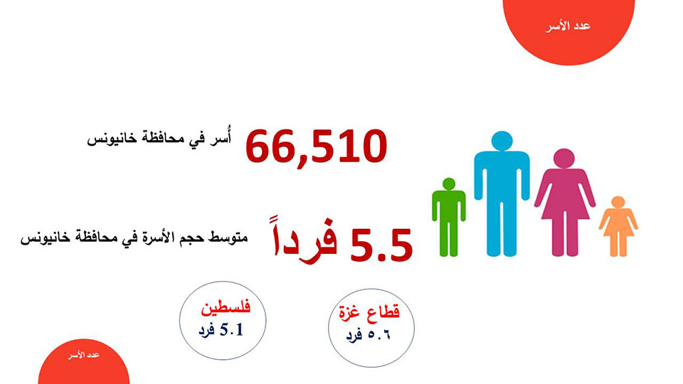 ويبلغ عدد الأسر في محافظة خانيونس 66,510، ومتوسط حجم الأسرة في الحافظة 5.5فرداً، كما أكد قحمان أن مجتمع محافظة خانيونس مجتمع فتي فيبلغ نسبة الفئة العمرية من 0_17 سنة 48.6% من مجموع السكان.