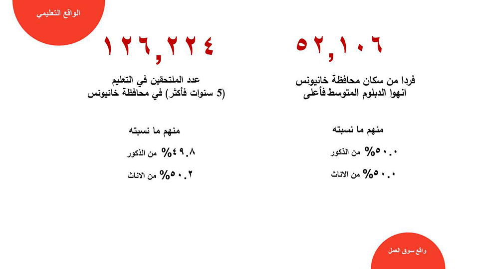 كذلك معرفة مدى الاحتياج للأبنية المدرسية والجامعات ورياض الأطفال بما يتناسب مع النمو البشري في المحافظة، كذلك معرفة أعداد الخريجين وتخصصاتهم ونسب البطالة بينهم ووضع الخطط اللازمة للحد من البطالة والاستفادة من الخريجين حسب سوق العمل.